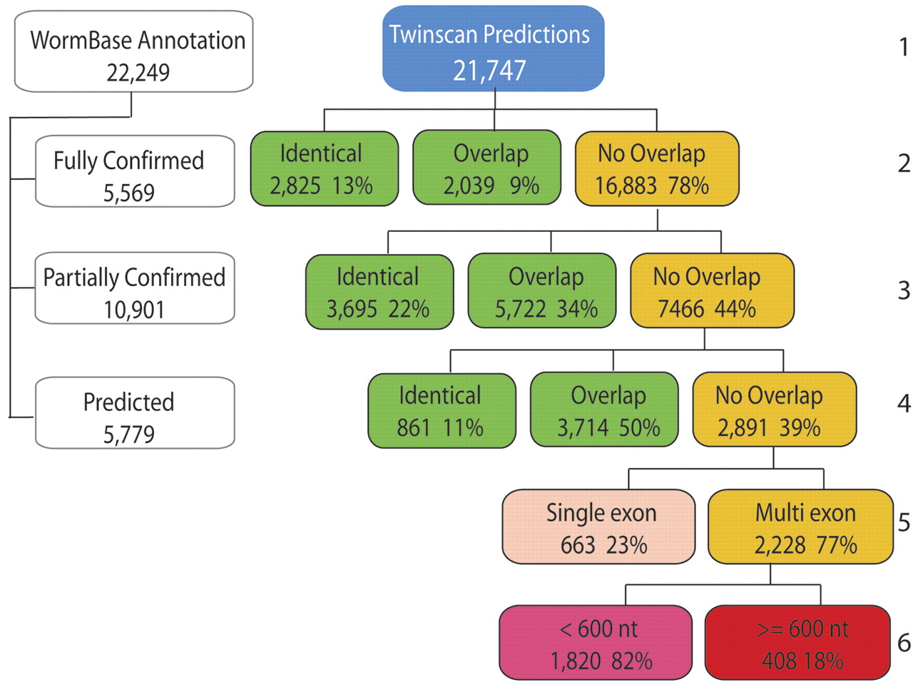 Breakdown of genome-wide predictions by TWINSCAN 2.01 in comparison to the WS130 annotations. (Row 1) Total number of WormBase annotations and TWINSCAN predictions. (Row 2) Breakdown of TWINSCAN predictions into those that are identical to fully confirmed WormBase predictions, those that overlap but are not identical, and those that do not overlap (orange). (Row 3) Breakdown of TWINSCAN predictions that do not overlap fully cDNA-confirmed ORFs by comparison to the partially cDNA confirmed WormBase ORFs. (Row 4) Breakdown of TWINSCAN predictions that do not overlap fully or partially confirmed WormBase ORFs by comparison to predicted WormBase ORFs. (Row 5) Breakdown of TWINSCAN predictions that do not overlap any of the above into single exon (beige) and multiexon (orange) predictions. (Row 6) Breakdown of novel multiexon TWINSCAN predictions into those that are shorter than 200 amino acids (pink) and those that are at least 200 amino acids (red). Analysis of predictions by an earlier and slightly less accurate version of TWINSCAN (2.0α), by comparison to WS100 ORFs, placed 265 novel ORFs of at least 200 amino acids in the red box, all of which were tested experimentally.
