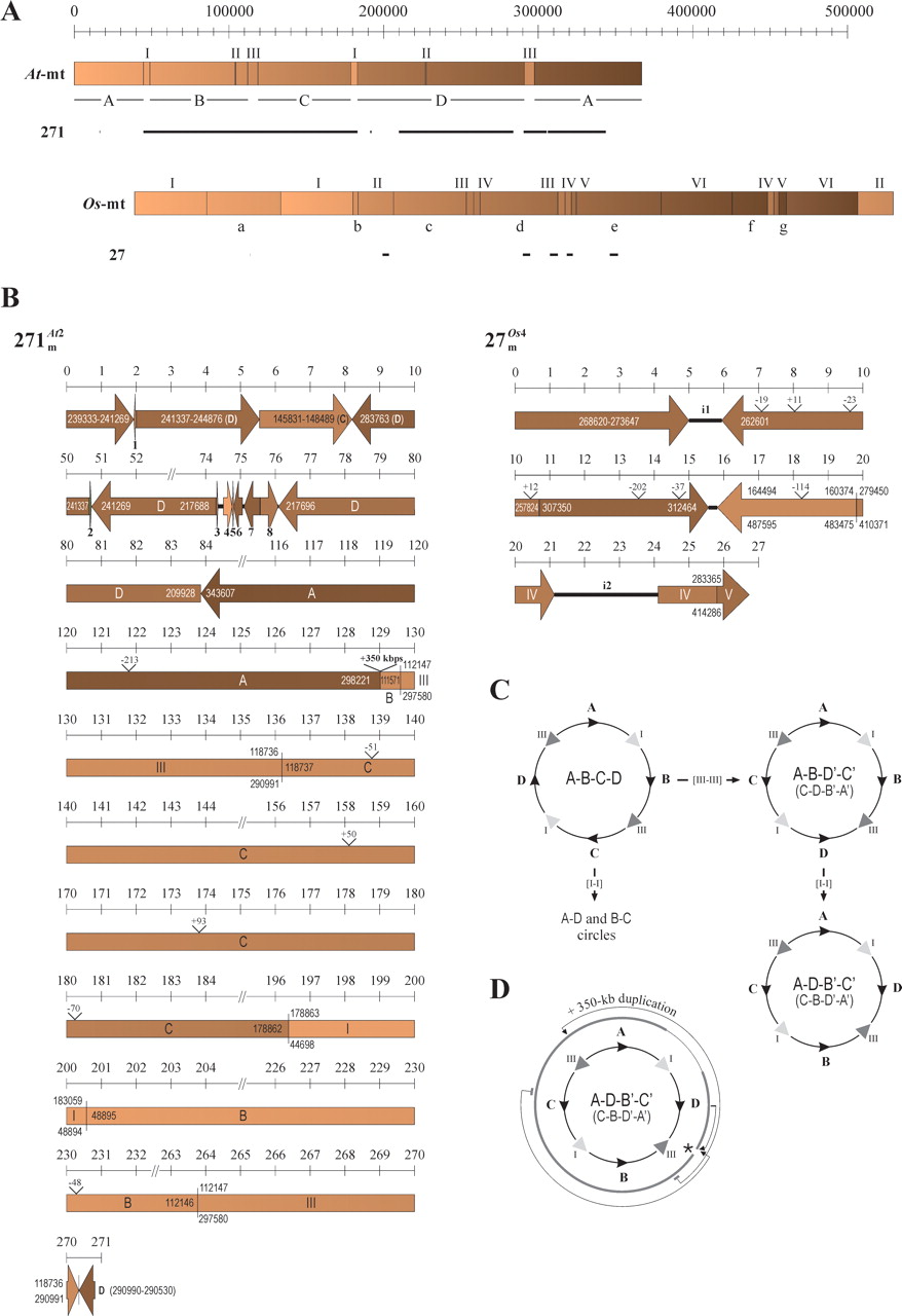 , which contain rearranged DNA from the mitochondrial chromosome of Arabidopsis and rice, respectively. (A) Structure of the Arabidopsis (At-mt) and rice (Os-mt) mtDNAs. For the Arabidopsis mtDNA, the position of the four single-copy regions A, B, C, and D, as well as the three pairs of specific repeats (I, II,
