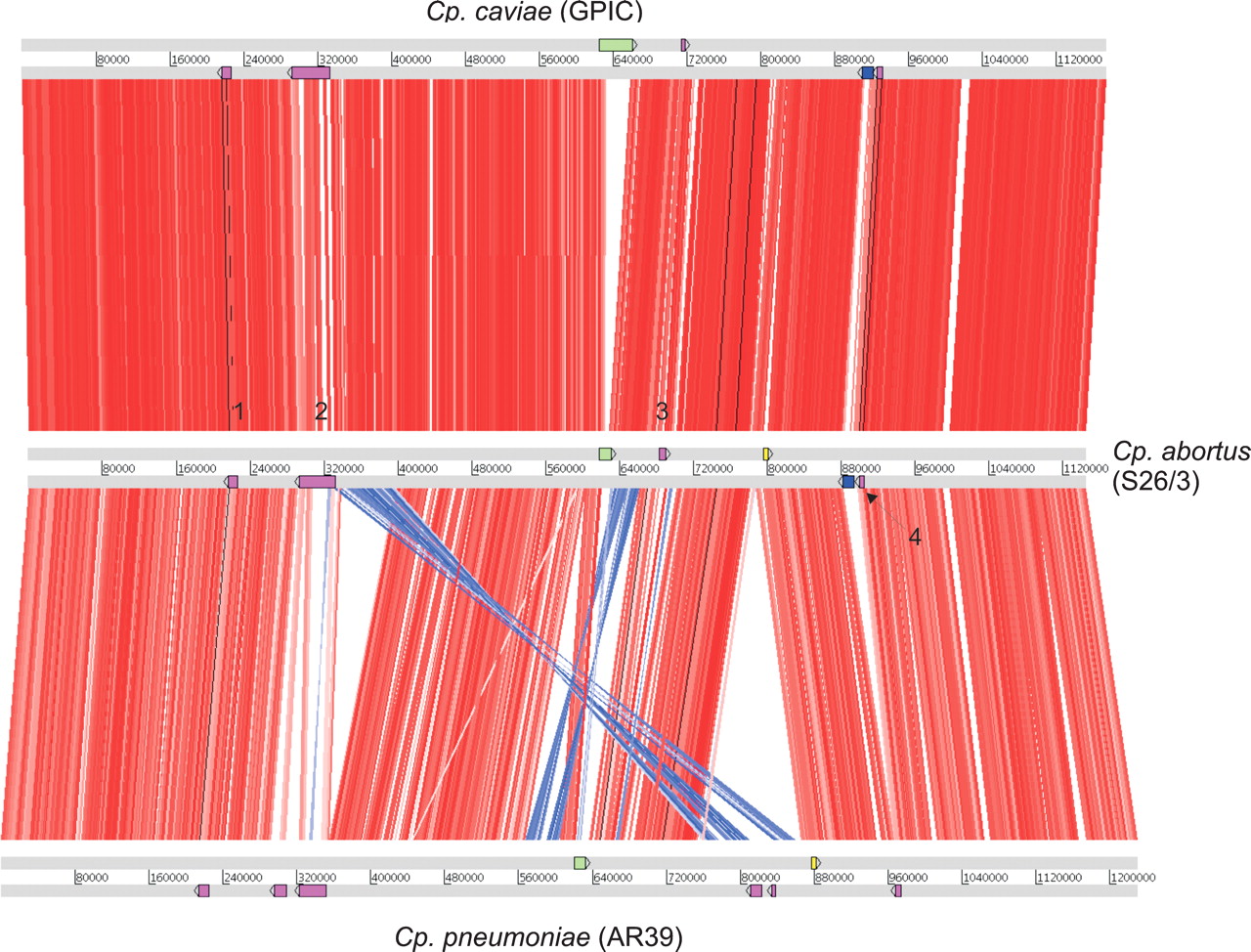 Global comparison between Cp. caviae (GPIC), Cp. abortus (S26/3), and Cp. pneumoniae (AR39). The figure shows ortholog matches (see Methods; displayed using ACT http://www.sanger.ac.uk/Software/ACT/) of the three sequenced Chlamydophila genomes. Gray bars represent the forward and reverse strands of DNA with the scale marked in base pairs. The red bars between the DNA lines represent individual forward ortholog matches, with inverted matches colored blue. The positions of the PZ region (green), pmp clusters (purple; numbered 1–4), tmh cluster (blue), and biotin biosynthetic operon (yellow) are shown as colored boxes on the DNA lines. All the genomes have been oriented at the origin of replication to start at the hemB gene.