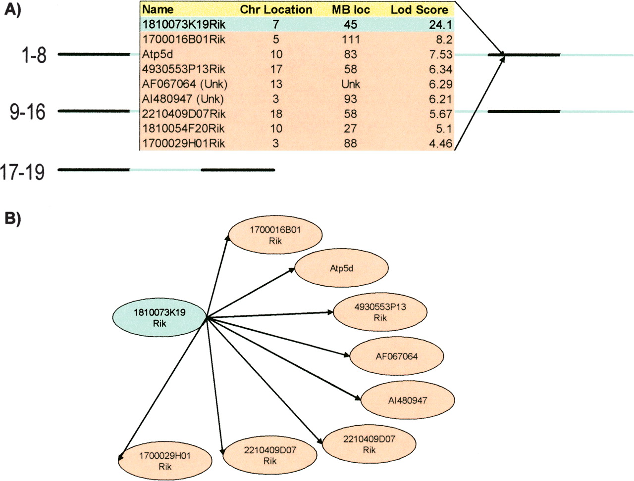 Genes with eQTL that are coincident with the physical location of the 1810073K19Rik gene test as reactive to the strong cis-acting 1810073K19Rik gene-expression perturbation, providing direct support that this cluster of eQTL obtains in response to the 1810073K19Rik perturbation. (A) The list of genes linking to the chromosome 7 locus. Only 1810073K19Rik has its physical location coincident with this locus. (B) Graph supported by examining the correlation structures between the gene-expression traits and locus using the causality test (E.E. Schadt, J. Lamb, X. Yang, J. Zhu, S. Edwards, D. GuhaThukarta, S.K. Sieberts, S. Monks, M. Reitman, C. Zhang, et al., in prep.; Zhu et al. 2004).