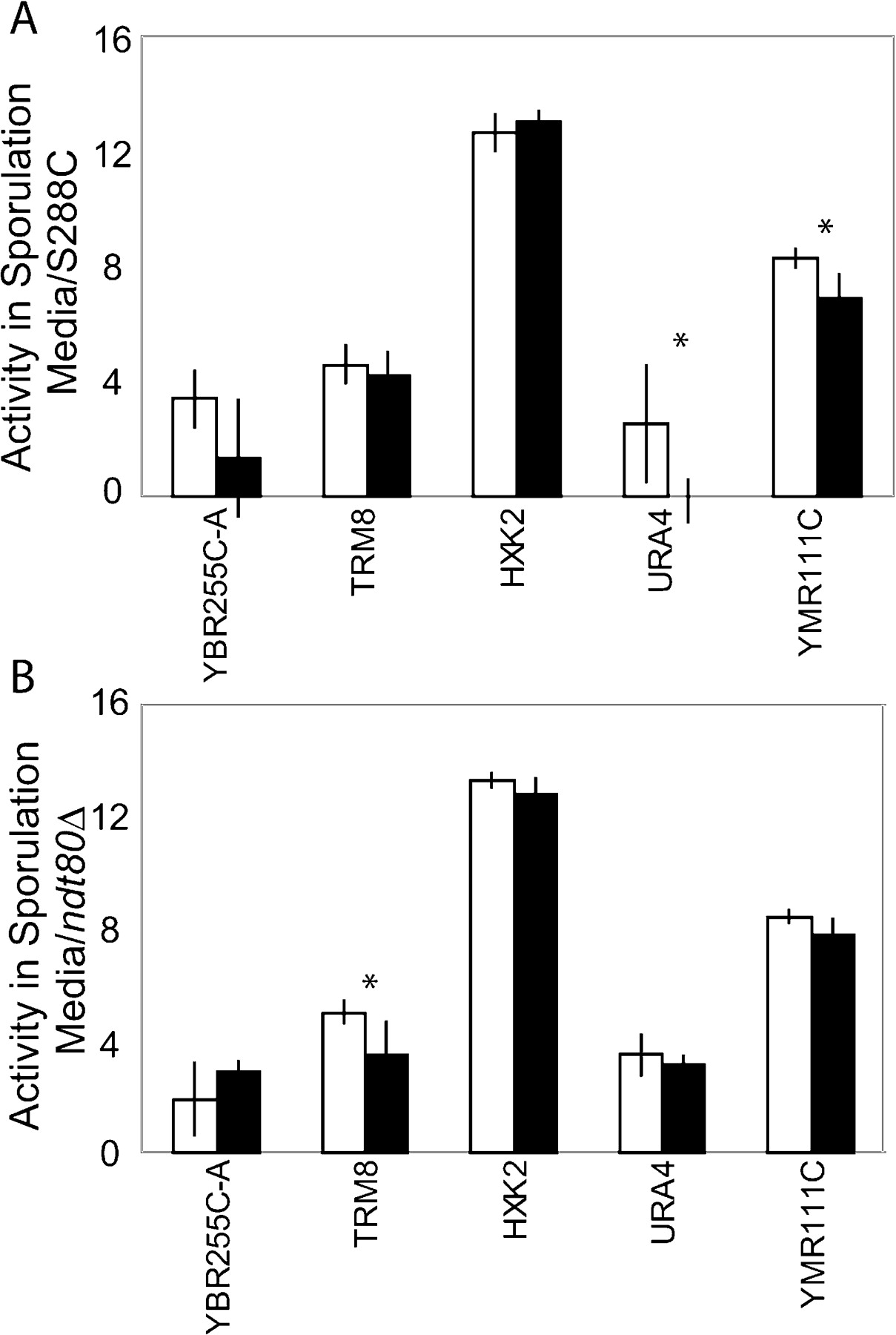 Expression levels from five unconserved Ndt80 sites that are present in S. cerevisiae promoters. Wild type is shown in white, mutant in black. Expression levels are from wild-type and mutant promoters in the S288C strain (A) and ndt80Δ strain (B) after8hin sporulation media. The data displayed are the log2 of the mean β-gal expression intensity of five biological replicates. * = P < 0.05, ** = P < 0.01, by Student's t-test.