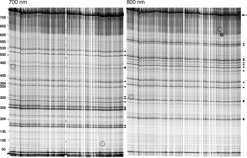 Tilling screen. Example of a gel used for mutation detection within the Sara-4 amplicon in 96 balanced mutant lines; 700 (left) and 800 nm (right) emission images showing the fragments generated by Cel-I-based heteroduplex cleavage. (Arrowheads) Fragments generated by cleavage at 14 different silent background polymorphisms in the balancer that could be reidentified by sequencing; (circles) two novel mutations. Notice that both the polymorphisms and the novel mutations appear in both channels with complementary sizes. In the case of the second mutation, the longer fragment (800-nm channel) is less distinguishable (asterisk). After sequencing, we could, however, reconfirm that this signal corresponds to a bona fide mutation. Note also that the silent polymorphisms are present in all 96 lines, reflecting the fact that the balancer is itself isogenic. New mutations appear only in individual lines. Full-length product, 747 bp (arrow). Cleavage of the two new mutants yields 440 bp (700 nm) + 315 bp (800 nm) (lane 4) and 90 bp (700 nm) and 660 bp (800 nm) (lane 80).
