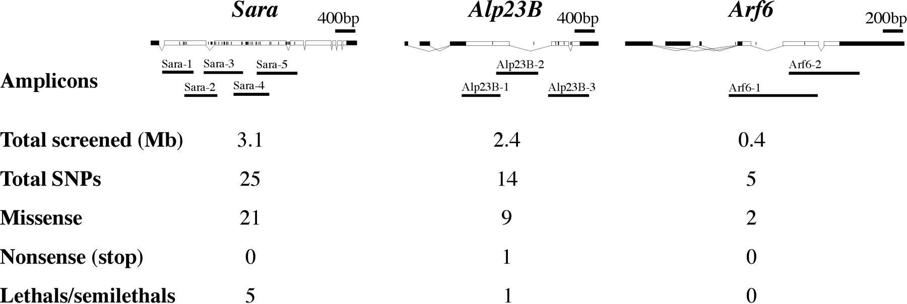 Mutation spectrum in three genes. Genomic organization of Sara, Alp23B, and Arf6. White boxes represent the ORFs. Black boxes below (Sara-1 to 5, Alp23B-1 to 3, and Arf6-1,2) correspond to the position of the amplicons considered in this study. Total DNA screened, number of SNPs, missense, nonsense, and lethal mutations are listed. Lines within the ORF and introns represent the position of the balancer polymorphisms.