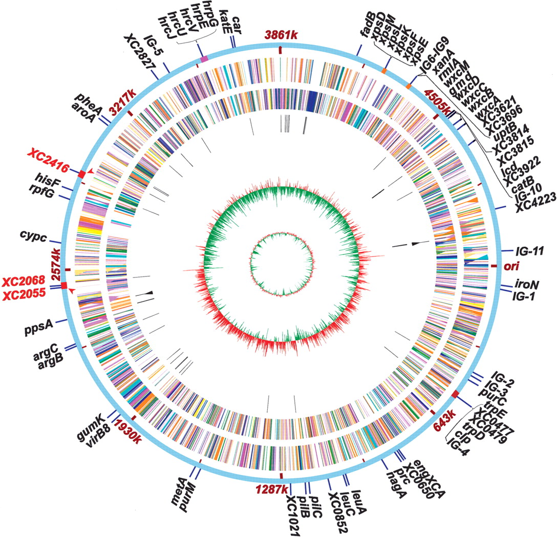 Circular representation of the Xcc 8004 genome and EZ::TN transposon insertion sites of virulence-reduced mutants. Circles range from 1 (outer circle) to 7 (inner circle). (Circle 1) EZ::TN insertional locations, gene names, or codes are according to Supplemental Table 3; (IG) intergenic region; ori, the origin of DNA replication; Red arrowheads indicate Xcc 8004 strain-specific chromosomal segments. (Circle 2) CDSs on forward strand. (Circle 3) CDSs on reverse strand. (Circle 4) tRNA genes. (Circle 5) rRNA genes. (Circle 6) GC skew [(G-C)/(G+C)], red indicates values >0 and green <0. (Circle 7) G+C contents. Colors in circle 2 and 3 represent functional categories; orange for intermediary metabolism; green for biosynthesis of small molecules; blue for macromolecule metabolism; magenta for cell structure; khaki for cellular processes; green for biosynthesis of small molecules; light-blue for mobile genetic elements; pink for pathogenicity, virulence, and adaptation; yellow for hypothetical and conserved hypothetical proteins; dark-green for ORFs with an undefined category.