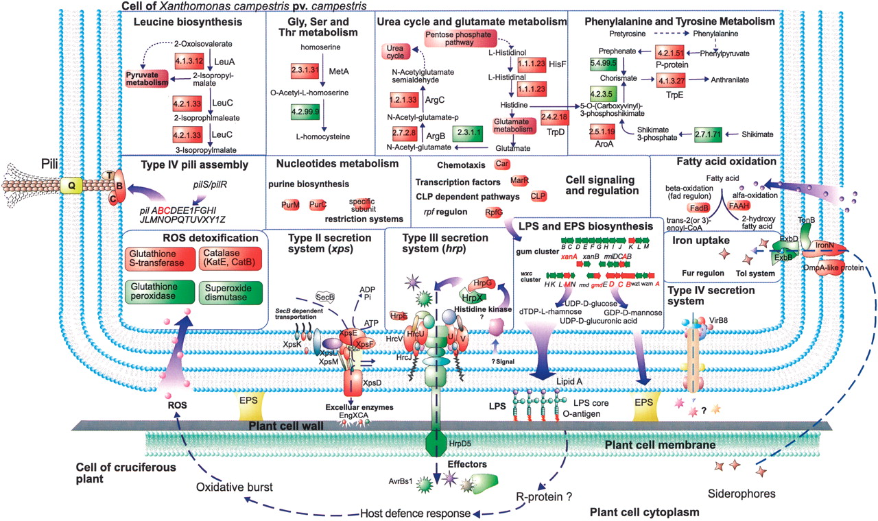 A schematic illustration of the experimentally determined interaction between Xcc and host cell. The principle pathways are shown in bold. Putative metabolic pathways were predicted by KEGG. Bacterial genes and gene products associated with pathogenicity are arranged within colored frames. Genes identified in this study are framed in red, while genes that were reported previously in xanthomonads are framed in green. (EPS) Exopolysaccharides; (FAAH) fatty acid α hydroxylase; (Hrp) hypersensitive response and pathogenicity genes; (LPS) lipopolysaccharides; (ROS) reactive oxygen species; (R-protein) resistance gene protein; (Xps) Xanthomonas protein secretion.