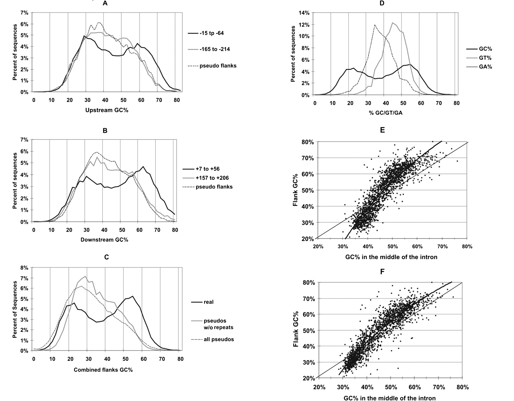 GC% distributions of flanks. (A,B) GC% distributions of 50-nt flank regions upstream and downstream of exons, respectively. The solid curves show the GC% distribution of sequence windows at the indicated distances (black curves, -15 to -64; gray curves, -165 to -214) from the 3′ or 5′ end of exons. The dashed curve shows the GC% distribution of the closer 50-nt windows in the flanks of pseudo exons. (C) GC% distributions of averaged GC% of both closest 50-nt windows (i.e., -15 to -64 and +7 to +56) upstream and downstream of exons, compared with the same distribution of pseudo exons with or without repeats. (D) GC% distribution for real exon flanks as in C compared with their GT% and GA% distributions. (E,F) Flanks tend to exaggerate GC%. (E) GC% of flanks is plotted against GC% of the remainder of the introns. (F) The same as A, but with repeats masked.