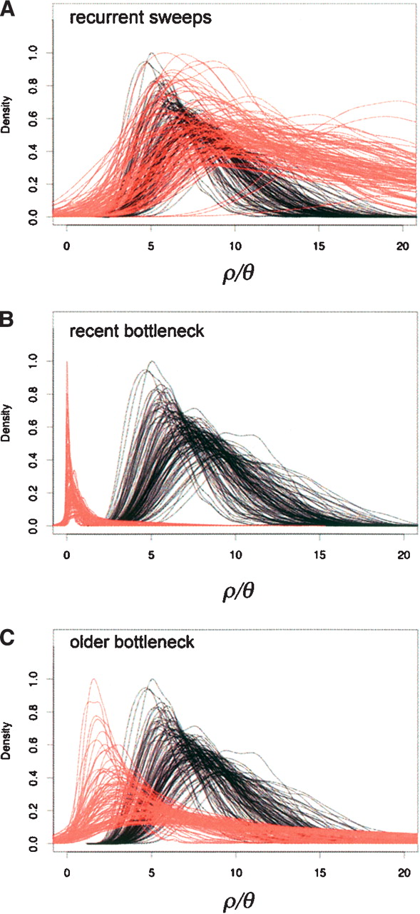 The effect of (A) recurrent hitchhiking, (B) a very recent bottleneck, and (C) a less recent bottleneck on multilocus estimates of ρ/θ. Each curve represents one of 100 simulated replicates of 10 independent loci. In red are 100 replicate distributions of ρ/θ for data simulated under sweeps or a bottleneck. In black are 100 replicate distributions of ρ/θ for the ancestral population. For the hitchhiking model (A), the relevant parameters used are the strength of selection, s = 0.005, the effective population size, Ne = 2.5 million, and the expected number of sweeps in 4Ne generations, λ = 0.00004. In bottleneck (B), the population size is reduced by a factor f = 0.05 between 0.014Ne and 0.12Ne generations ago. In bottleneck (C), we model the same reduction in Ne between 0.12Ne to 0.24Ne generations ago. For all models, the average reduction in variability (π) was set to ∼0.4 of the ancestral population θ.