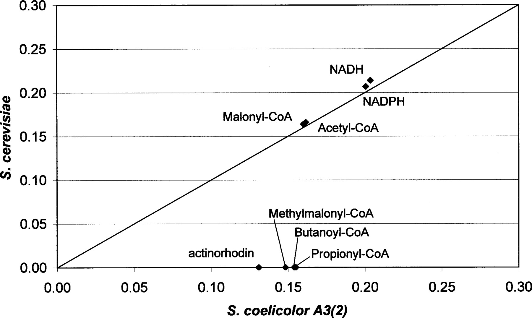 Predicted polyketides production capabilities of S. coelicolor A3(2) and S. cerevisiae (Förster et al. 2003a) (in moles per mole glucose). All the calculations were made for the glucose uptake rate of 1 mmol/g DW/h.