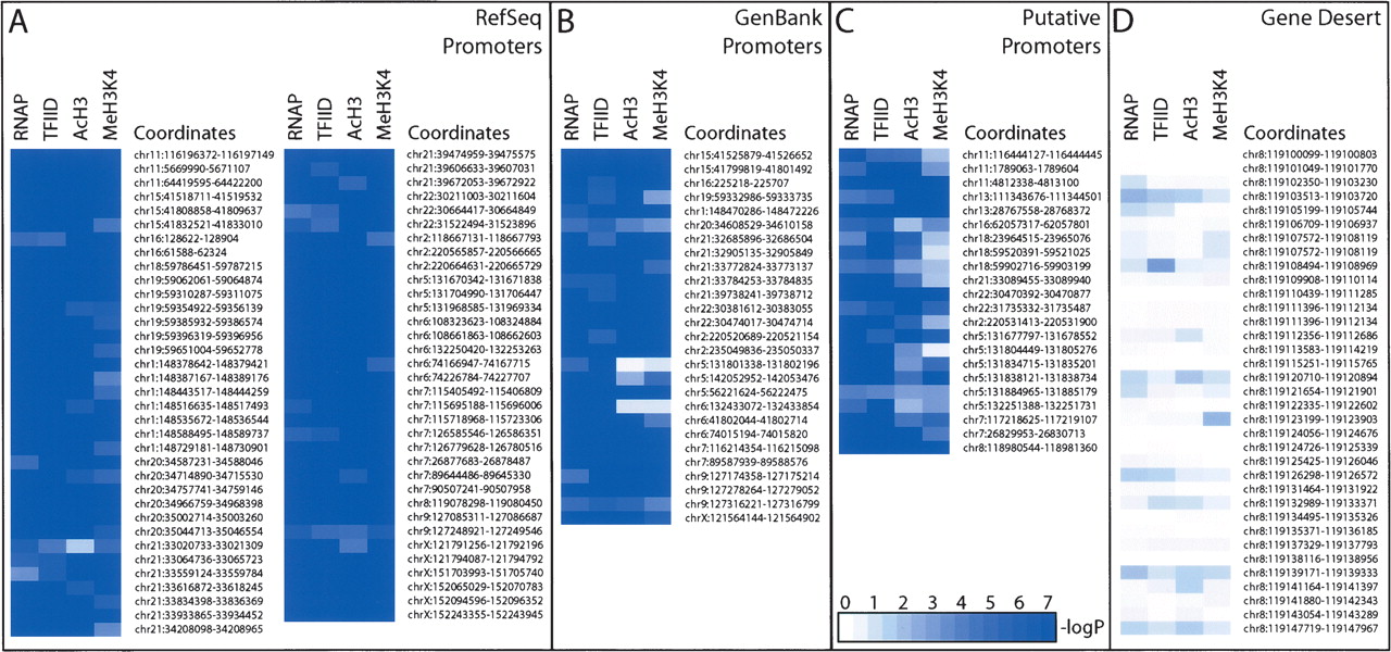 Summary of histone modification status obtained for each PIC-binding site identified in IMR90 cells. White to blue gradient coloring is used to represent the negative logarithmic P values indicated in each column for RNAP ChIP, TAF250 ChIP, Acetyl Histone H3 (AcH3) ChIP, and Methyl K4 Histone H3 (MeH3K4) ChIP experiment data. (A) RefSeq supported promoters are listed. (B) GenBank supported promoters; (C) putative promoters; (D) transcriptionally inactive, heterochromatic region within ENr321 (gene desert). Actual confidence values for all the promoters are provided in Supplemental Tables S1 and S2. The coloring scale is noted in the bottom inset in C.