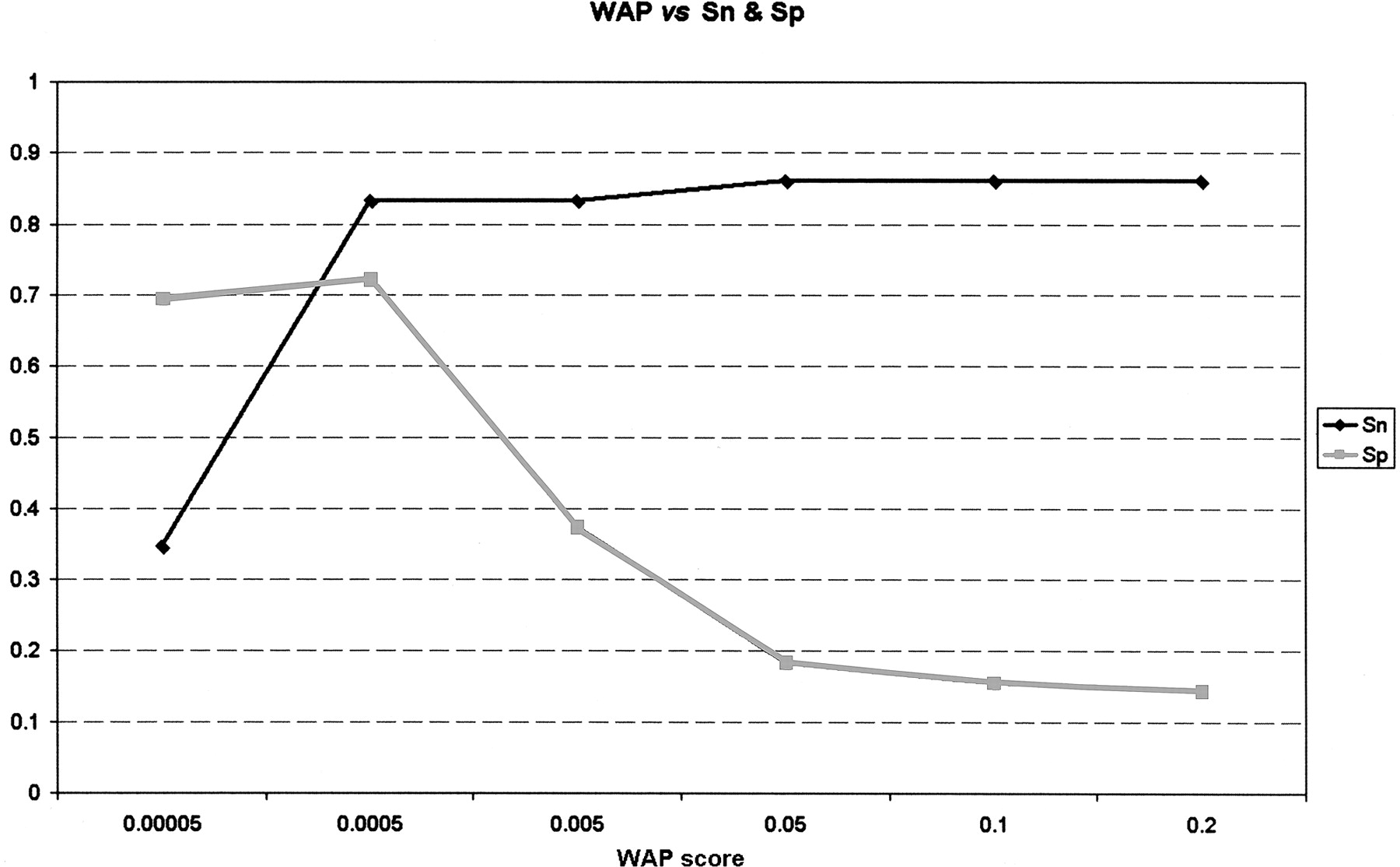 Performance of Footer in relation to the WAP threshold. This graph presents the sensitivity (black line) and specificity (gray line) over all promoter regions analyzed (see text). According to this graph, Footer performs best on a WAP threshold of 0.05%.