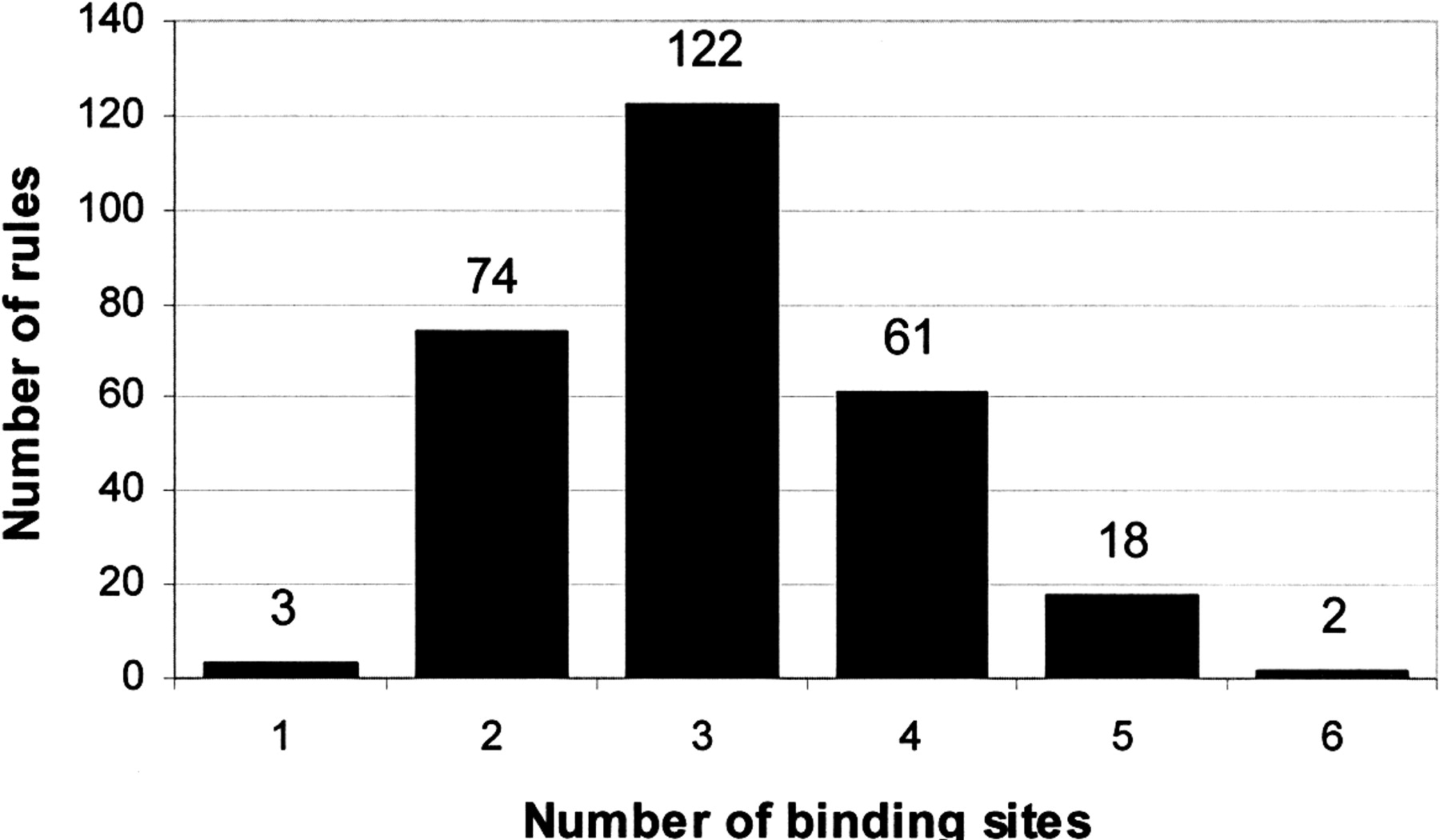 The figure shows how the rules induced from all expression data sets distribute over the number of binding sites included in the rules. The results indicate that most often three binding sites are required to obtain coexpression.