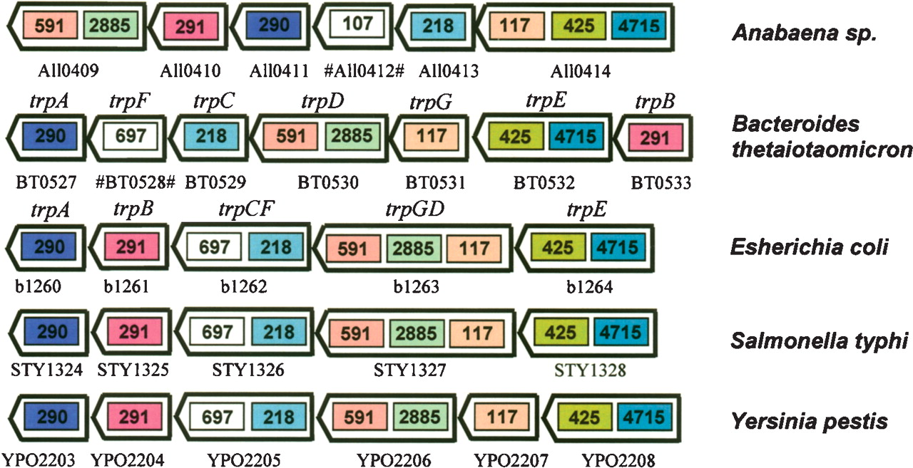 Part of the tryptophan operon as identified in five bacteria (δ = 3), exhibiting rearrangements and fusions of domains. Genes are labeled with their “ordered locus name” and, for E.coli and B. thetaiotaomicron, by their names.