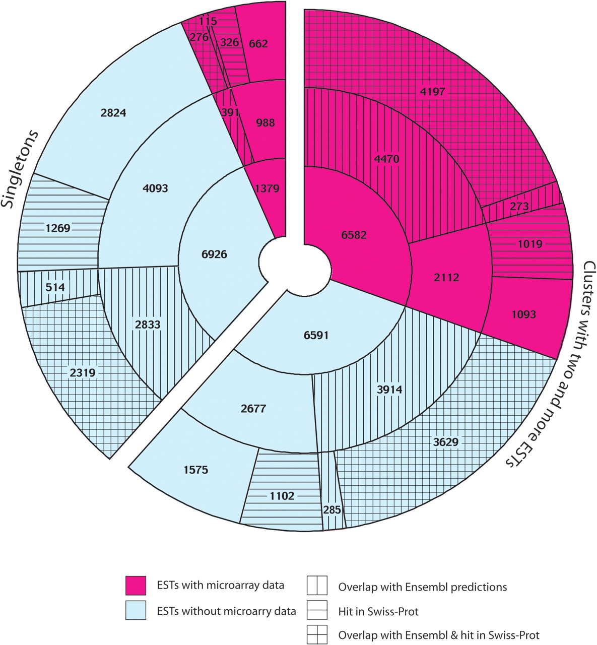 Analysis of the 21,478 T-clusters. The chart lists numbers of T-clusters, of which expression during mosquito development was confirmed by microarray experiments (pink) and numbers of clusters for which microarray-based expression was not tested or detected (blue). Numbers are provided separately for clusters with two or more ESTs (right) and singletons (clusters with one EST, left). For each category, the numbers of clusters with and without Ensembl gene predictions, as well as the numbers with and without homologs in UniProt/SWISS-PROT are indicated. The inner ring lists the total number of EST clusters with and without microarray data, and the outer two rings partition these clusters according to the associated annotation.