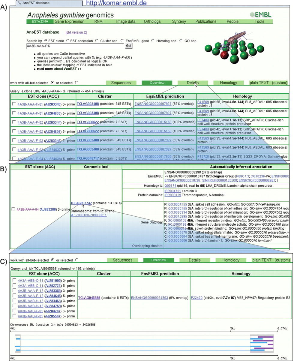 Interactive searches available in AnoEST. Searching with an EST clone identifier allows (A) an overview of associated EST sequences, corresponding clusters, overlapping Ensembl genes, and best hit in the SWISS-PROT database and its description. (B) The detailed view gives, in addition, coordinates of EST cluster match to the genome, links to orthologous groups identified on the basis of corresponding Ensembl gene predictions, protein domains collected in the InterPro database, and corresponding GO terms. When examining EST clusters, (C) a graphical representation of overlapping ESTs permits visualization of the underlying exon-intron structure.