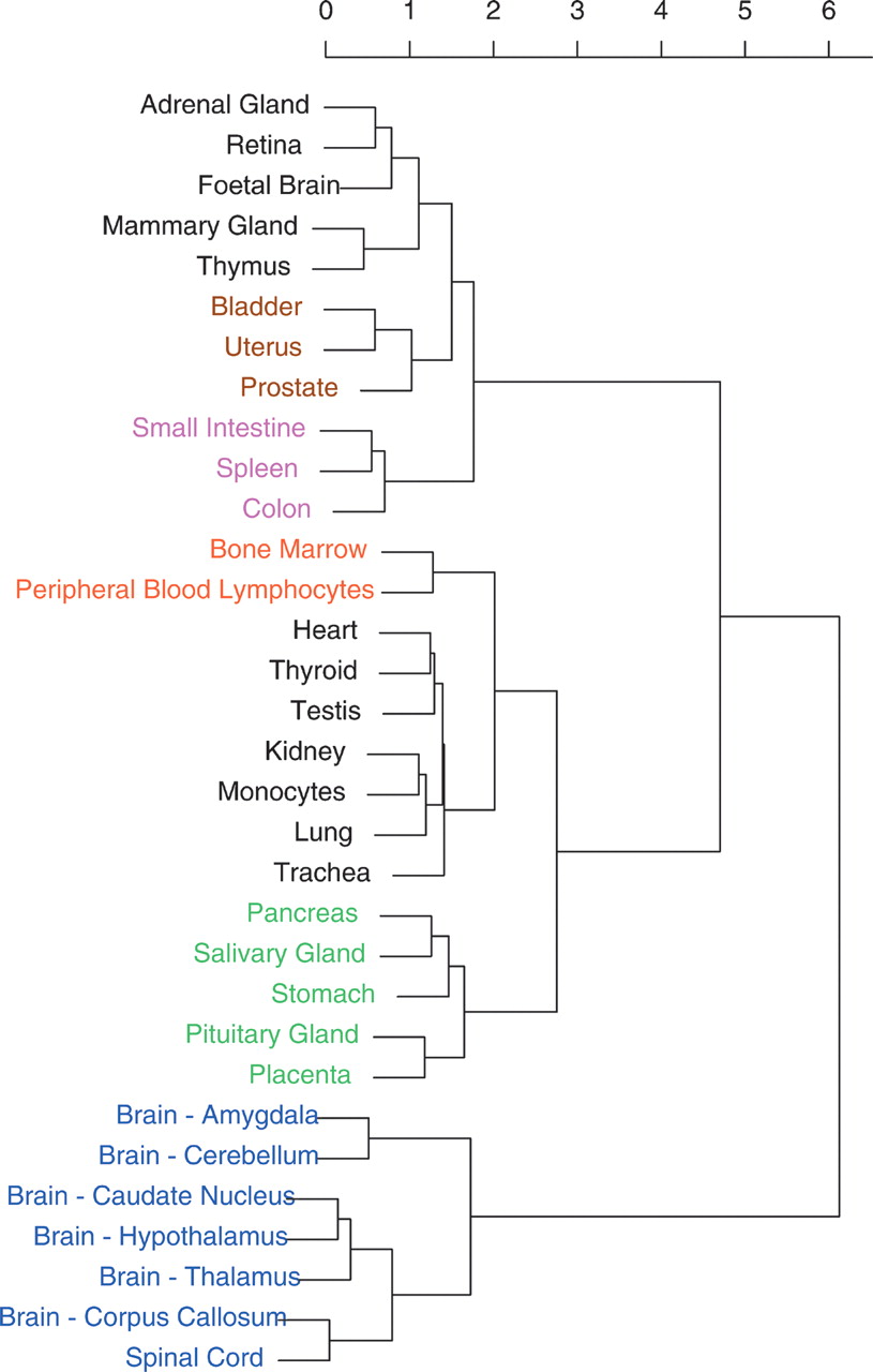 Hierarchical clustering of tissues based on their pairwise distances (d = 1 - r), using the Ward statistical method. Groups of clustered tissues are colored according to common properties: (magenta) lymphoid tissues; (red) hematopoietic tissues; (green) intestinal tract; (blue) central nervous system.