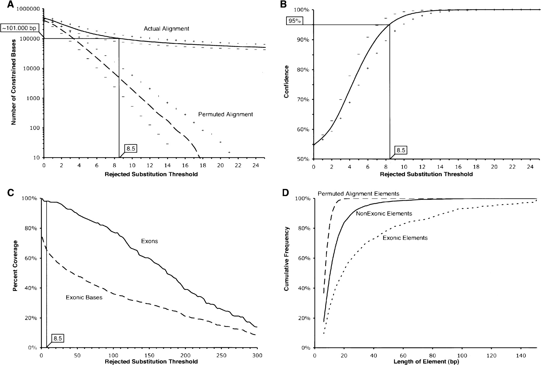 Confidence and sensitivity of GERP as a function of the rejected substitution threshold used to identify constrained elements. (A) Number of constrained element bases identified in the real alignment (solid line) and permuted alignments (dashed line). (B) Confidence is defined as the number of constrained element bases in the actual alignment divided by the sum of the constrained element bases in the actual and permuted alignments (see Methods). In A and B, the curves indicated with “+” and “–” characters result from analyses using a neutral rate estimate that is 10% greater or less, respectively, than the estimate of 3.85 neutral subs/site. A vertical black line marks the RS score threshold of 8.5 (corresponding to a confidence of ∼95%). (C) The fraction of exons that overlap at least one constrained element (solid line), and the fraction of exonic bases within a constrained element (dashed line). (D) Cumulative frequencies of the sizes of constrained elements at an RS of 8.5 or greater, with permuted alignment elements (heavy dashed line), exclusively nonexonic constrained elements (solid line), and exonic elements (light dashed line).