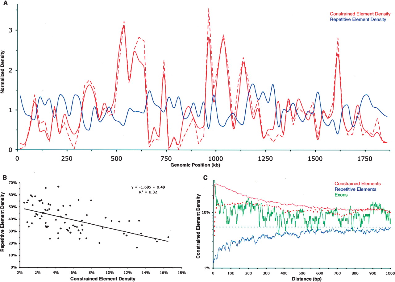 Constrained elements tend to cluster, and this clustering is inversely correlated with repetitive element density. (A) Densities of constrained elements (red) and repetitive elements (blue) along the length of the human CFTR locus. Densities are determined for consecutive, nonoverlapping 25-kb windows, and each window is normalized by the locus-wide average. The solid red line corresponds to constrained elements identified with a merging tolerance of one unconstrained column, as opposed to six unconstrained columns for the dashed line (Fig. 1A; see Methods). (B) Regional constrained element density vs. repetitive element density. The values for each 25-kb window used in A are shown. The equation and trendline correspond to a simple linear regression model relating the two variables, with an R2 value of 0.32. (C) Constrained element density as a function of distance from various features (see Methods); (solid red line) constrained elements with a merging tolerance of one unconstrained column; (dashed red line) constrained elements with a merging tolerance of six unconstrained columns; (green line) exons; (blue line) repeats. Note that the behavior of the red lines very near the origin is a result of the fact that a pair of elements cannot be within the “merge distance” of each other (see Methods).