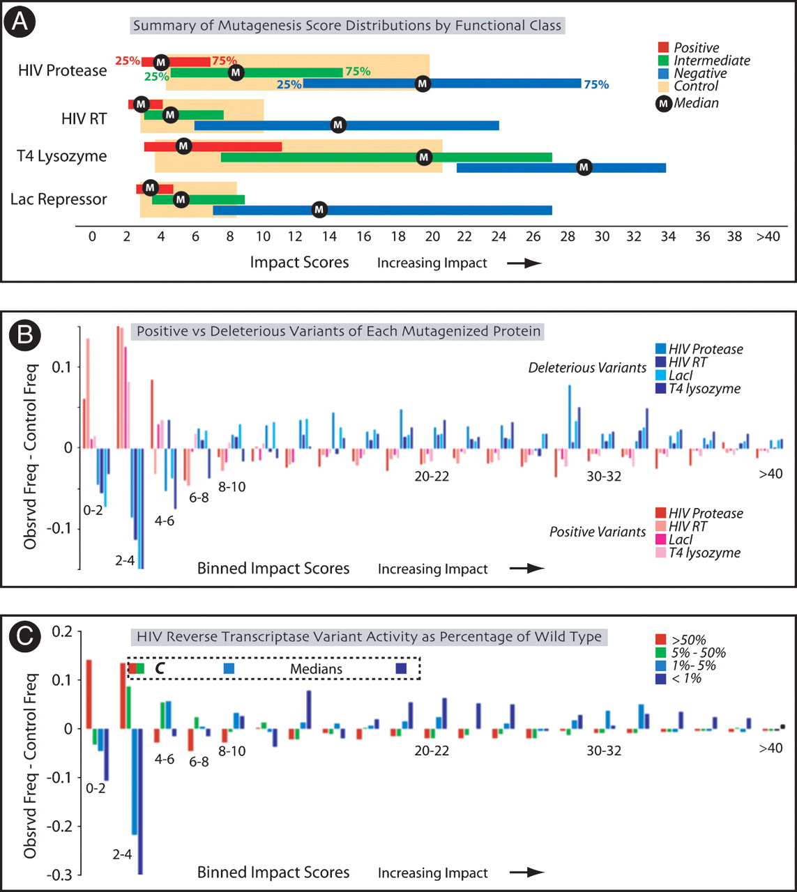 Comparison of MAPP scores of protein variants with mutagenesis studies. (A) Scores of protein variants assayed in the four mutagenesis experiments. Variants were partitioned by function as positive (red), intermediate (green), or negative (blue). The interquartile range (25%–75%) of MAPP scores for each set is shown, with the median value denoted by the M. Interquartile ranges of control distributions are in tan. (B) Deleterious variants (blue; intermediate plus negative from A) and positive variants (red; from A) are contrasted. MAPP scores for each set were segregated in bins of width two from zero to 40 (shown left to right); observed frequencies were calculated by dividing bin counts by the total number of variants in that set. Vertical bars show the difference between observed frequencies and control frequencies, with the latter obtained similarly from the appropriate control distribution. (C) Contrast between experimental distribution versus control distribution as in B of HIV reverse transcriptase variants. Variants were partitioned by enzymatic activity relative to wild-type (>50%, red; >5% but ≤50%, green; >1% but ≤5%, light blue; ≤1%, dark blue). Colored squares show the median MAPP score of each variant class above the bin to which it belongs, with C representing the median of the control distribution.