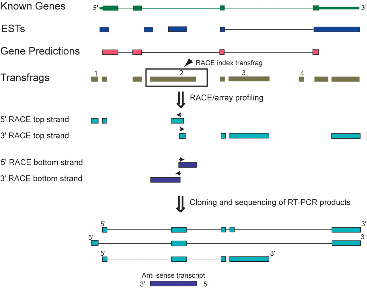 A schematic representation of the transcriptome data and RACE/array workflow. An example of a locus defined by bounds of a known gene is shown together with additional existing genome annotations, such as ESTs and GenScan predictions. Exons are represented by boxes and introns by lines. Throughout all of the figures, transcriptome data derived from array profiling of cellular RNA are represented by transcribed fragments (transfrags; olive green).