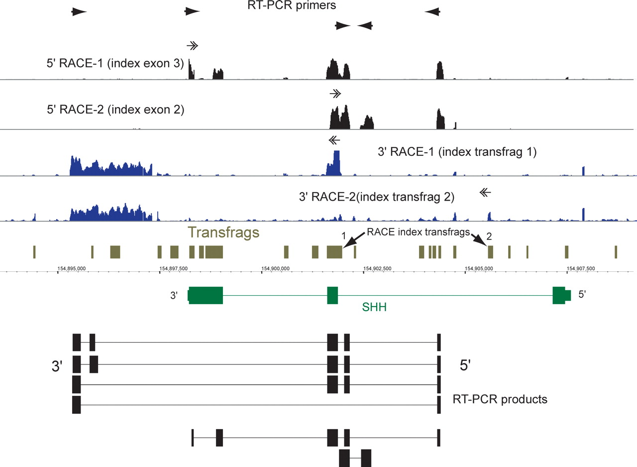 Several novel exons can be found in the gene SHH, which encodes a human homolog of Sonic hedgehog. The 5′-RACE/array profiling was performed with primers designed in exons 2 and 3 of the annotated form. The 3′-RACE/array profiling was performed with primers positioned in two unannotated transfrags in intron 1 (indicated by the arrows). A significant amount of signal can be seen in intron 1 of the gene, representing alternative exons of this gene. The annotated form of exon 3 appears to be represented as two different exons. An alternative 3′-exon was detected downstream of the annotated gene bounds. The maps of cloned RT-PCR products representing different alternative isoforms of transcripts containing novel exons are shown at the bottom.