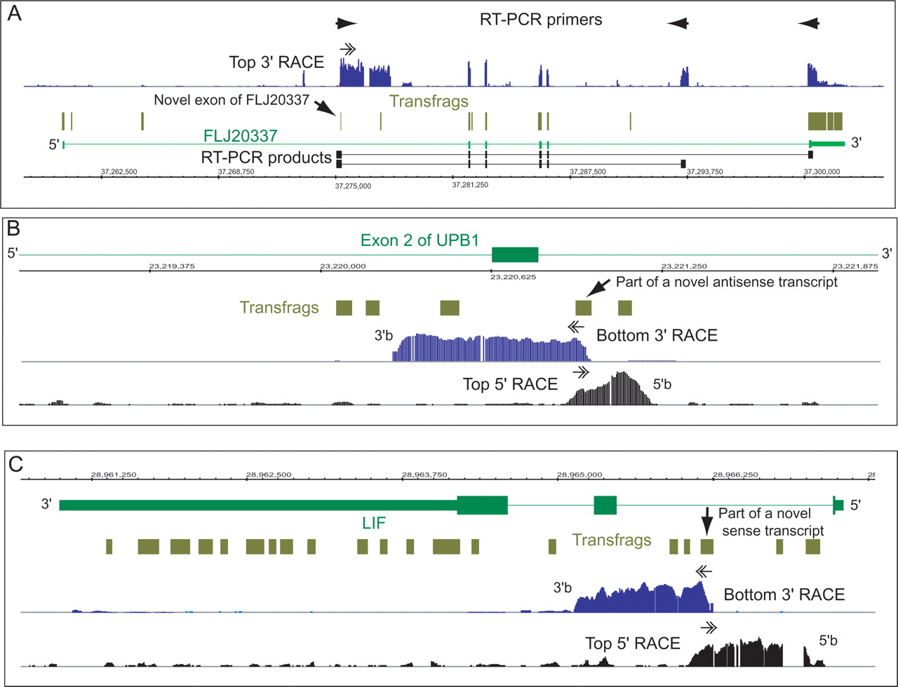 Different classes of novel intronic transfrags revealed by RACE/array. (A) A novel transfrag (shown by an arrow) within RIKEN cDNA FLJ20337 (top strand, Chromosome 6) represents a novel exon of this gene, as evidenced by the 3′-RACE/array profile and sequences of two different RT-PCR products. (B) Several novel intronic transfrags represent a bottom-strand transcript antisense to the UPB1 gene (top strand, Chromosome 22), as evidenced by 5′- and 3′-RACE/array analyses. (C) Intronic transfrags within the LIF gene (bottom strand, Chromosome 22) represent internal sense transcripts as evidenced by 5′- and 3′-RACE/array analysis. Approximate positions of the 5′- and 3′-ends of the transcripts on the bottom strand in panels B and C are indicated as “5′b” and “3′b.”