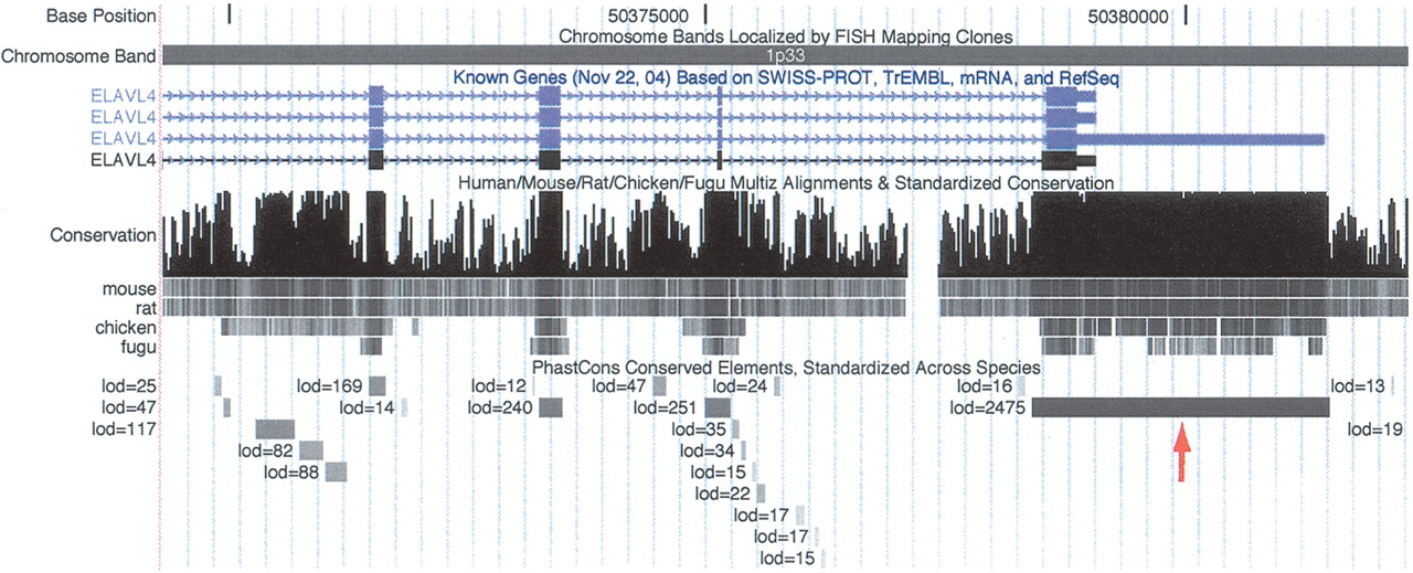 Extreme conservation at the 3′ end of the ELAVL4 (HuD) gene, an RNA-binding gene associated with paraneoplastic encephalomyelitis sensory neuropathy and homologous to Drosophila genes with established roles in neurogenesis and sex determination (http://www.ncbi.nlm.nih.gov/entrez/query.fcgi?db=OMIM). The 3117-bp conserved element that overlaps the 3′ UTR of this gene (arrow) is the fifth highest scoring conserved element in the human genome (log odds score 2475). Several conserved elements in introns are also visible.