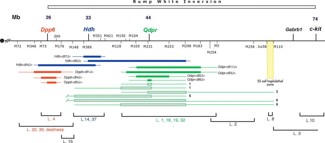 Map locations of lethal mutations. The proximal region of Chr. 5 is depicted as a horizontal line, with the centromere (filled circle) on the left. The region spanned by the Rw inversion is indicated above; its breakpoints are within Dpp6 proximally and near c-kit distally. Map positions (in megabases, accordingly to mouse genome Build 33) are indicated. Microsatellite loci are abbreviated by exchanging the prefix “M” for “D5Mit.” Deletions are indicated as horizontal rectangles, either solid or striped, and are color coded with the locus at which they were induced (red) Dpp6; (blue) Hdh; (green) Qdpr. The amount of DNA known to be absent in each deletion is spanned by the rectangles. The thin lines extending from the ends of the rectangles indicate the regions in which the deletion breakpoints reside. Those deletions that have been converted into stocks of mice are represented by solid rectangles, and associated allele names are given (the bracketed text corresponds to superscripting). New deletions at the Qdpr locus existing only in ES cells are represented by the striped or unfilled rectangles. In this latter case, the number of independent ES cell lines containing a particular class of deletion (currently indistinguishable with the markers used in this study) is indicated on the right. The intervals containing certain lethal mutations (abbreviated as “L. #”) are bracketed at the bottom of the map. Those that were deletion mapped are color coded. Those that were recombination mapped are in black. The yellow-shaded “ES cell haplolethal zone” is an interval that connot be deleted in ES cells. Originally described by Schimenti et al. (2000), its proximal end has been refined as described in the text, and the distal end was also refined by further analysis of deletions centered at the Gabrb1 (data not shown). (Shh) Sonic hedgehog homolog.