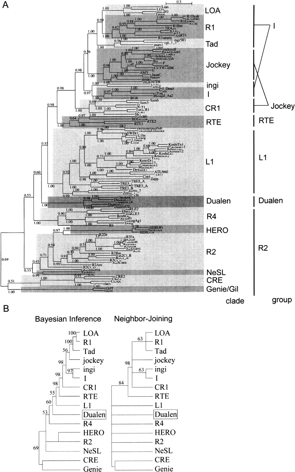 Phylogenetic analyses of reverse transcriptase (RT). (A) The Bayesian phylogenetic inference. Posterior probabilities are indicated. Markov chain Monte Carlo (MCMC) chain length was 500,000 generations with trees sampled every 10 generations; the first 3300 trees were discarded as burn-in. (B) The 50% consensus trees of the Bayesian inference and the Neighbor-Joining methods. Retrotransposons belonging to the same clade are compressed. Posterior probabilities (Bayesian inference) and bootstrap values (Neighbor-Joining) are indicated as a percentage. HERO is not recognized as clade, but treated independently here due to its indefinite position. The sources of sequences in the L1, R4, HERO, R2, NeSL, CRE, and Genie/Gil clades are given in our previous study (Kojima and Fujiwara 2004). Others are given in the report by Malik et al. (1999). The alignment used to generate this tree is based on two previous alignments, ds36752 (Malik et al. 1999) and ALIGN 00231 (Burke et al. 2002), and available as Supplemental Figure 1.