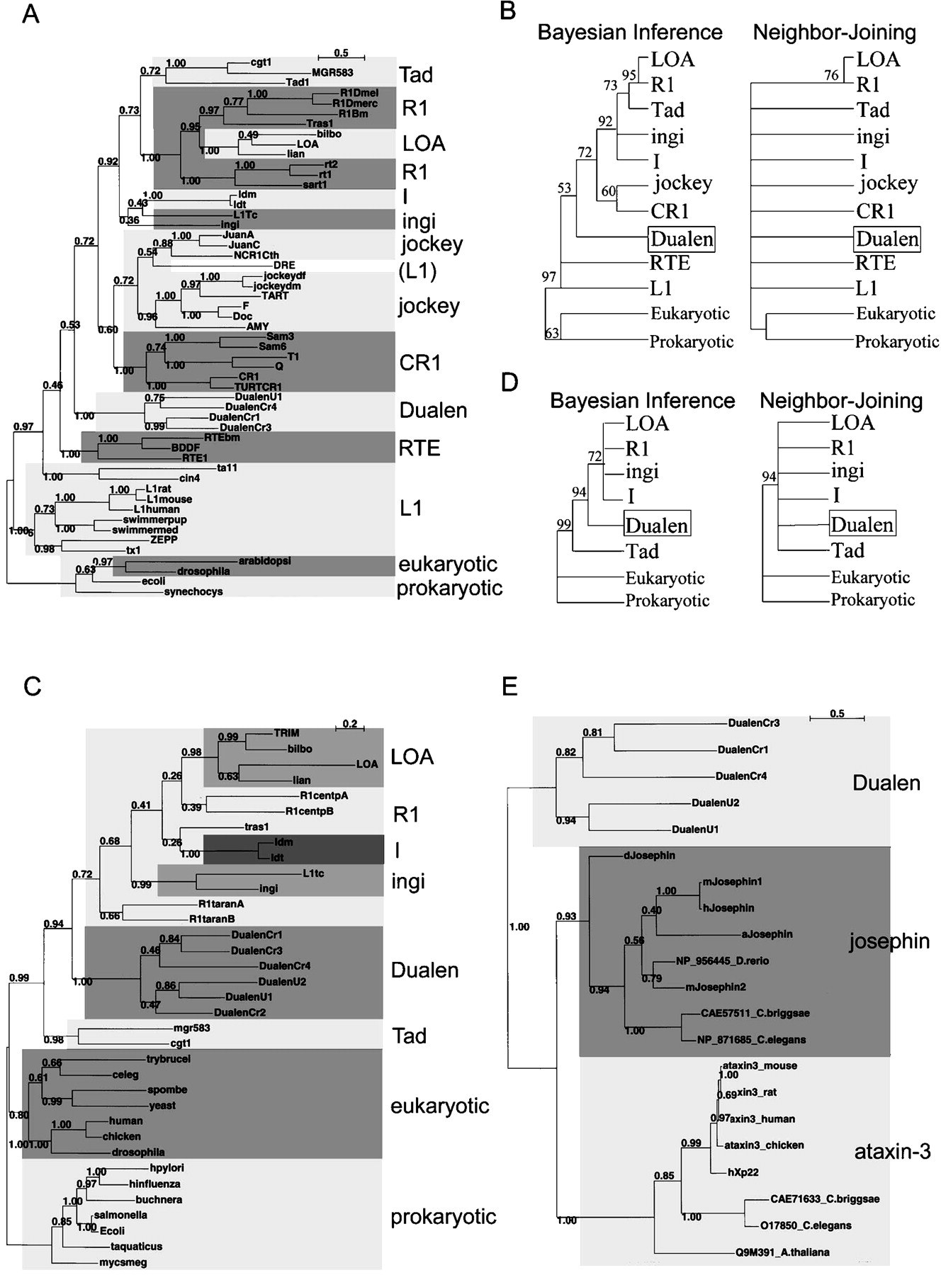 Phylogenetic analyses of apurinic/apyrimidinic endonuclease-like endonuclease (APE), ribonuclease H (RNH), and josephin-related cysteine protease (JCP). (A) The Bayesian phylogenetic inference tree of APE. Posterior probabilities are indicated. MCMC chain length was 150,000 generations with trees sampled every 10 generations; the first 1000 trees were discarded as burn-in. (B) The 50% consensus APE trees of the Bayesian inference and the Neighbor-Joining methods. Retrotransposons belonging to the same clade are compressed. Posterior probabilities (Bayesian inference) and bootstrap values (Neighbor-Joining) are indicated as a percentage. (C) The Bayesian phylogenetic inference of RNH. MCMC chain length was 100,000 generations with trees sampled every 10 generations; the first 700 trees were discarded as burn-in. (D) The 50% consensus RNH trees of the Bayesian inference and the Neighbor-Joining methods. (E) The Bayesian phylogenetic inference of JCP and josephin. MCMC chain length was 100,000 generations with trees sampled every 10 generations; the first 400 trees were discarded as burn-in.