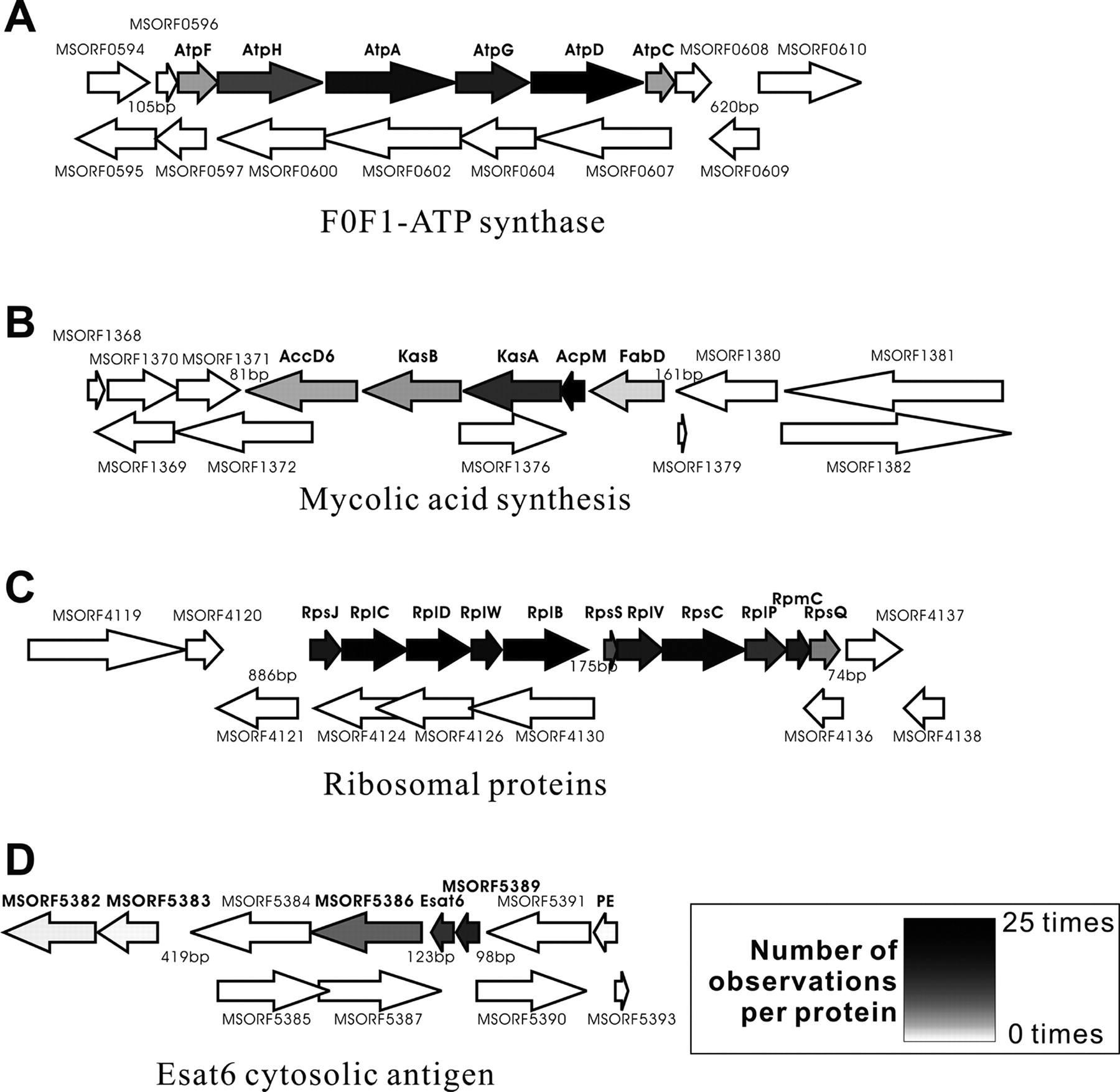 Proteins encoded in the same operon were observed to be coexpressed across the 25 experiments. All proteins observed in LC/LC/MS/MS experiments are labeled in bold, with arrows shaded according to the number of observations. Four distinct operons (A–D) are indicated.