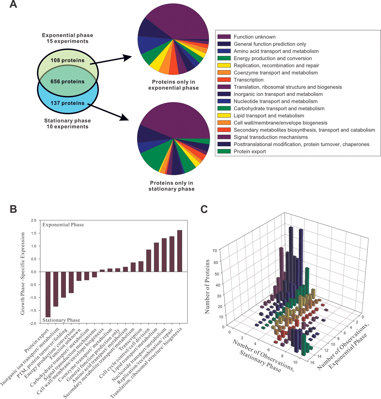 A comparison of the proteomes of exponential and stationary-phase cells. (A) The overlap of identified proteins in exponential and stationary phases (left chart), showing the functions of proteins specific to exponential phase (top right chart) or stationary phase (bottom right chart). For clarity, proteins with uncharacterized functions are excluded from the pie charts. (B) COG functions for the proteins differentially expressed in exponential and stationary phases. For the proteins in each COG