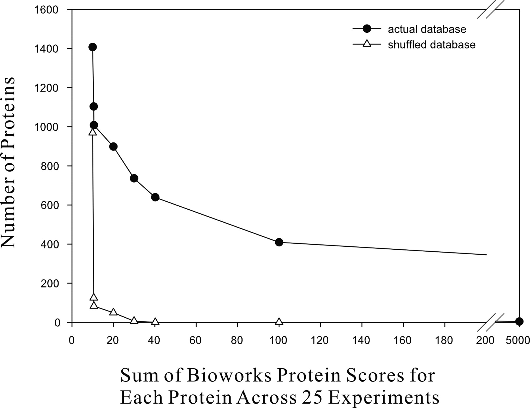 Estimating the protein identification error rate. The false-positive protein identification rate (triangles; estimated by comparing MS/MS spectra against a mass spectrometry reference database of shuffled M. smegmatis proteins) is plotted as a function of total BioWorks score for each protein. At a false-positive identification rate of ∼5% (corresponding to proteins with total scores >20 across the 25 experiments), 899 proteins are identified (circles).