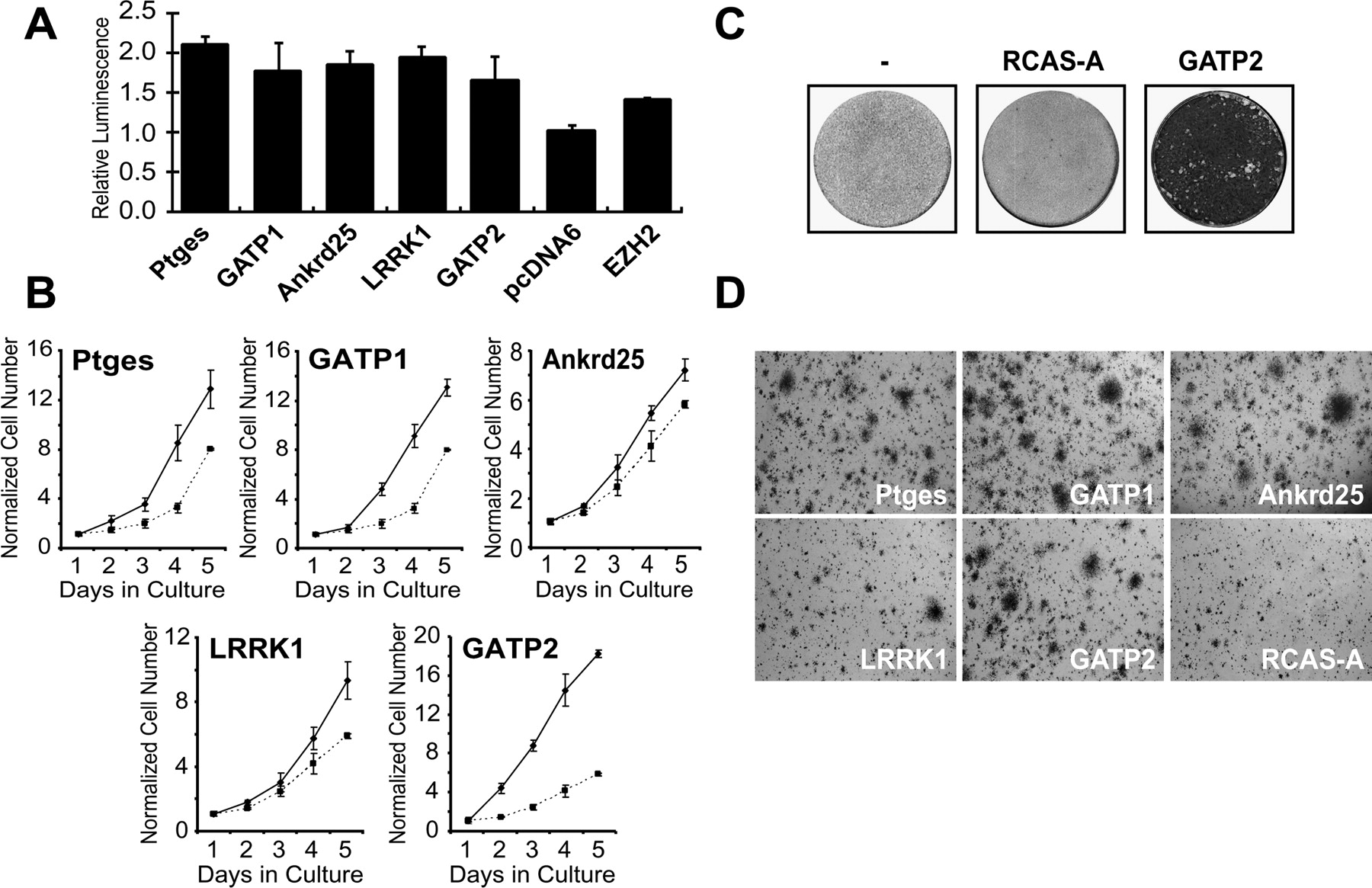 Validation of growth-activating and transforming abilities of identified proteins. (A) Overexpression of LRRK1, Ankrd25, Gatp1, Gatp2, and Ptges in HEK293 cells induces cell proliferation under serum-deprived conditions. Changes in luminescence, indicative of intrawell ATP levels, are presented relative to pcDNA6-transfected control. (B) Ectopic LRRK1, Ankrd25, Gatp1, Gatp2, and Ptges expression (solid lines, respectively) confers increased growth kinetics in primary cells, as compared to an empty vector control (dotted lines). Primary CEFs expressing growth activators were seeded into 384-well plates at a density of 500 cells per well. Cell proliferation was monitored in culture for 5 d by quantitative fluorescence imaging with the Q3DM EIDAQ100. Images were analyzed using Cytoshop, and cell numbers were determined through Hoechst 33342 staining. (C) CEFs infected with Gatp2-expressing RCAS vector grown under serum rich agar show increased saturation density compared to uninfected (–) or vector-infected (RCAS-A) controls. CEF monolayers were infected with activator-expressing virus, or the parental RCASA control virus, and subsequently overlaid with agar medium (Bister et al. 1977; Bos et al. 1990). Foci were visualized after 3–4 wk in culture by crystal violet staining. (D) CEFs ectopically expressing LRRK1, Ankrd25, Gatp1, Gatp2, and Ptges were embedded in soft agar, and colony growth was monitored over 4 wk (Bister et al. 1977). Infection with the parental viral vector RCAS-A was used as a negative control.