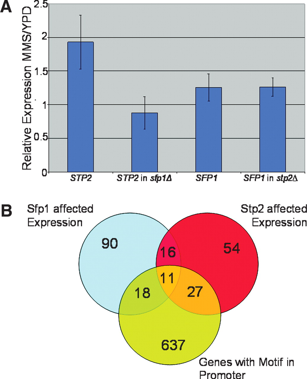 Microarray experiments. (A) Comparison of STP2 and SFP1 gene expression. Bar height shows the expression in MMS relative to a reference sample divided by expression in YPD compared with the same reference sample; error bars represent 1 SD. (B) Venn diagram showing the overlap of genes whose expression is significantly altered in an stp2Δ mutant, genes whose expression is significantly altered in an sfp1Δ mutant, and genes that contain a copy of the motif in their promoter.