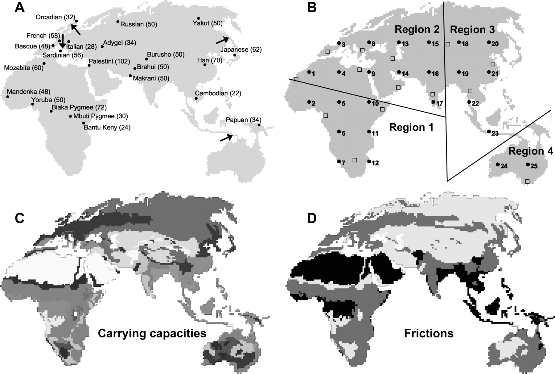 (A) Location, name, and size (within parentheses) of the 22 populations drawn from Rosenberg et al. (2002) for which genetic diversity was simulated. Arrows indicate the location of the four land bridges introduced to allow the complete colonization of the Old World and Oceania, since four samples (Orcadian, Sardinian, Japanese, and Papuan) are localized in islands. We imposed a low carrying capacity (K = 10) for demes located on these bridges to simulate a likely Founder Effect associated with the settlement of these islands. (B) Location of the 25 simulated origins (black dots). Open squares indicate the location of the 14 pseudo-observed origins. The four genetic regions defined in Rosenberg et al. (2002) are defined by the straight black lines. (C) Representation of relative carrying capacity values. (D) Representation of relative friction values. In C and D, darker colors indicate relatively higher carrying capacity or friction values.