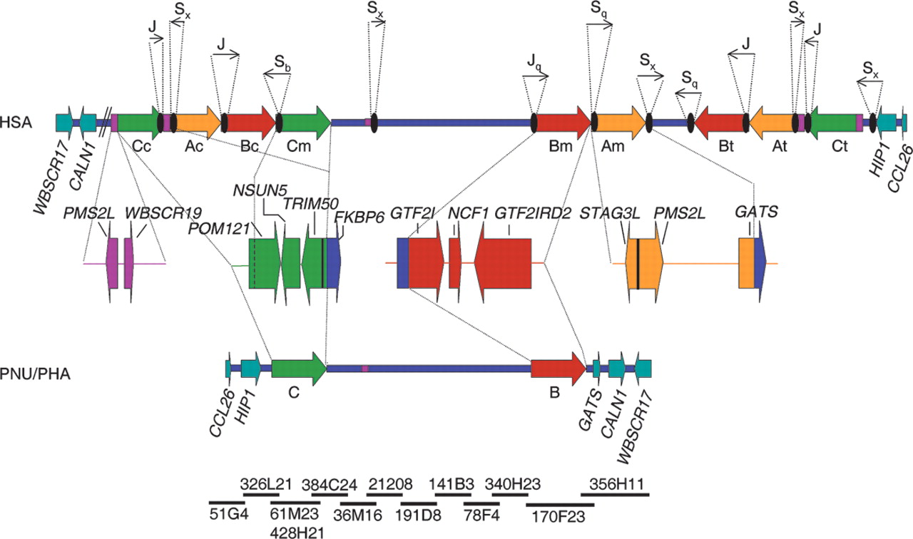 Schematic representation of the genomic structure of the WBS deletion region with the flanking segmental duplications in humans (HSA), and the homologous region in baboon (PNU/PHA). The large blocks of segmental duplications in the human map (A in yellow, B in red, C in green) are represented by thick arrows to indicate their relative orientation with respect to each other. They are exclusively present in the human map, whereas the baboon's genome contains the ancestral loci as single-copy and no large segmental duplication. The blue line represents the single-copy region, and the genes located immediately outside the region in both directions are represented as light blue arrows indicating the transcriptional direction. Some of the multiple-copy modules present in other chromosome 7 locations are shown in purple. The composition of each duplicated block with the corresponding transcriptional units is shown below the human map. Black ovals represent the Alu repeats located at the edges of the segmental duplications in the human map, with arrows indicating their orientation and approximate size (either partialor full Alu elements) shown on top. Note that the entire region including the ancestral loci of the segmental duplications is inverted in baboon with respect to the flanking genes. To define the baboon genomic structure, a clone contig with sequenced BACs from the RP41 library available in public databases has been assembled (NISC Comparative Sequencing Initiative), shown at the bottom.