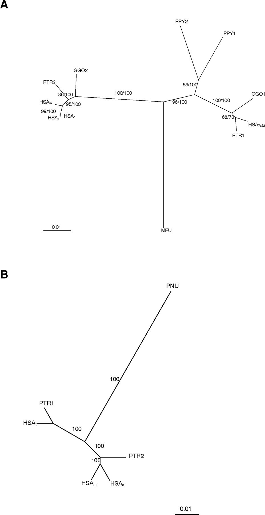 Phylogenetic trees based on the neighbor-joining method (nucleotide gamma: Tamura Nei) or Bayesian method. Subindexes c, m, t, and 7q22 refer to centromeric, medial, telomeric, and 7q22 chromosomal localization of the human PSVs, respectively. Number 1 refers to the copy more similar to the ancestral human gene, and number 2 to the other copy. (A) Neighbor-joining tree obtained for the STAG3 gene PCR product (BA/STAG3) including HSA, PTR, GGO, PPY, MFU, and PNU. Branch numbers refer to the neighbor-joining bootstrap values/clade credibility values for the Bayesian tree, which was of identical conformation. (B) Bayesian tree obtained for the Block C Large fragment, including HSA, PTR, and PNU. Branch values refer to the clade credibility values.