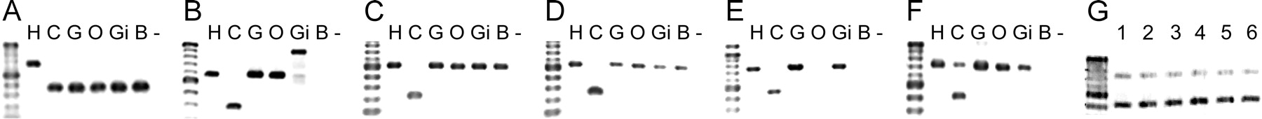 PCR and sequence evidence for precise Alu element deletion. (A-F) Cases C4, 14, 33, 42, 52, and 43 from Table 1; lanes are human (H), chimpanzee (C), gorilla (G), orangutan (O), gibbon (Gi), baboon (Ba), and no-template control (-). (G) Case 43; genomic PCR in six additional chimpanzees, labeled 1-6.
