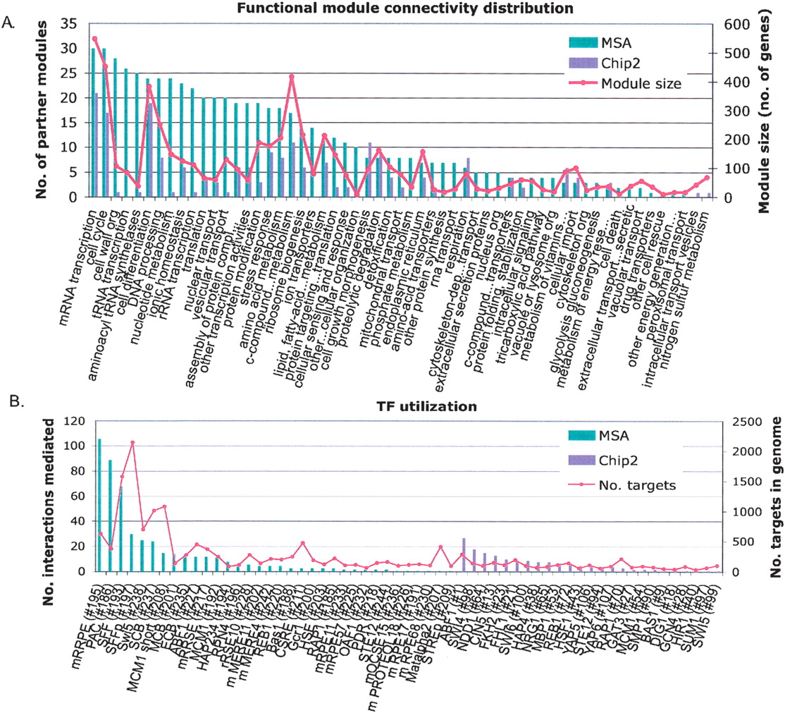 (A) Functional module connectivity histogram. For each module, the number of partner modules with which it is coordinated by at least one TF in at least one expression data set is shown. (Purple columns) MSA TFs, (green columns) Chip2 TFs, (pink line) module size. (B) TF utilization histogram. The number of pairwise module interactions mediated by each TF is shown on the left-hand axis. The right-hand axis shows the number of genome-wide promoter targets for each TF. (Purple column) MSA TFs, (pink column) Chip2 TFs, (pink line) promoter targets per TF.