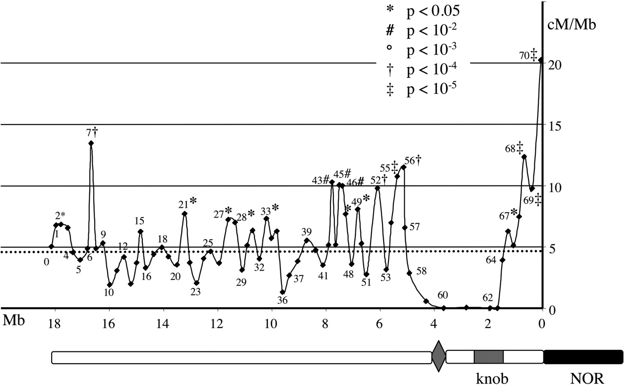 Variation of the CO rates on chromosome 4 of A. thaliana. The numbers refer to the intervals given in Supplemental Table 2. The dotted line represents the average CO rate on chromosome 4 (4.6 cM/Mb). A schematic representation of chromosome 4 of A. thaliana is aligned with the diagram. (Black box) NOR (nucleolar organizer region), (gray box) heterochromatic knob, (diamond-shaped box) centromere.