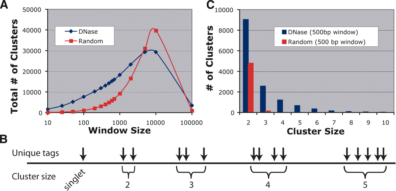Clustering analysis of sequences from DNase and random libraries. (A) The total number of clusters was determined for 15 different window sizes. For window sizes <5000 bp, there are larger numbers of clusters for the DNase library. For very large window sizes (100,000 bp), the majority of the DNase and random libraries cluster within only a few regions of the genome. (B) Example of how unique tags cluster into different sizes. The greatest spread between DNase and random libraries occurs at a 500-bp window. (C) Within this optimal window size, there are twice as many DNase clusters of two compared with random. Clusters of three or more are rarely found in random libraries.