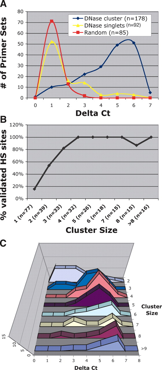 Validation of DNase clusters by real-time PCR. Delta (Δ) Ct values represent the number of additional cycles to achieve threshold amplification from nuclear DNA treated with DNase I compared with nuclear DNA not treated with DNase I. (A) Most primer sets that flank random regions of the genome display Δ Ct values less than two. Approximately 20% of primer sets that flank sequences from the DNase library that do not cluster with other sequences display Δ Ct values greater than two. Eighty percent of primer sets that flank DNase clusters of two or more display Δ Ct values greater than two. (B) The percentage of primer sets that have Δ Ct values greater than two was determined for each cluster size (% validated sites). Clusters of two were ∼50% accurate at identifying valid HS sites, while clusters of three or more were highly accurate at identifying valid HS sites. (C) The distribution of Δ Ct values was determined for different cluster sizes. Note that the highest cluster sizes have the highest Δ Ct values.