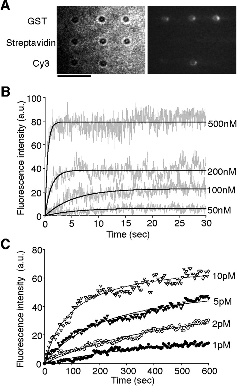 Analysis of the binding of low-molecular-weight molecules. GST and streptavidin coated microbeads were arrayed on a coverslip and the binding of Cy3-labeled GSH or biotin was monitored. (A) Microscopic images showing the binding of Cy3-labeled GSH to the protein-conjugated microbead array after the exposure to 200 nM Cy3-labeled glutathione for 30 sec. (Left) The bright-field image; (right) the Cy3-fluorescence image. Cy3-conjugated microbeads (Cy3) were used as a marker for fluorescence imaging. Scale bar, 5 μm. (B) Concentration dependence of the association of Cy3-labeled GSH to GST. Various concentrations of Cy3-labeled GSH were injected onto the protein-conjugated microbead arrays. Fluorescence images were collected at video rate. Gray lines represent the mean fluorescence intensities from three different microbeads. Black lines represent the nonlinear fitted curves. (C) The binding of Cy3-labeled biotin to streptavidin. Various concentrations of Cy3-labeled biotin were injected onto the protein-conjugated microbead arrays. Fluorescence images were collected at 5-sec intervals. The symbols represent the mean fluorescence intensities from four different microbeads. Black lines represent the nonlinear fitted curves.