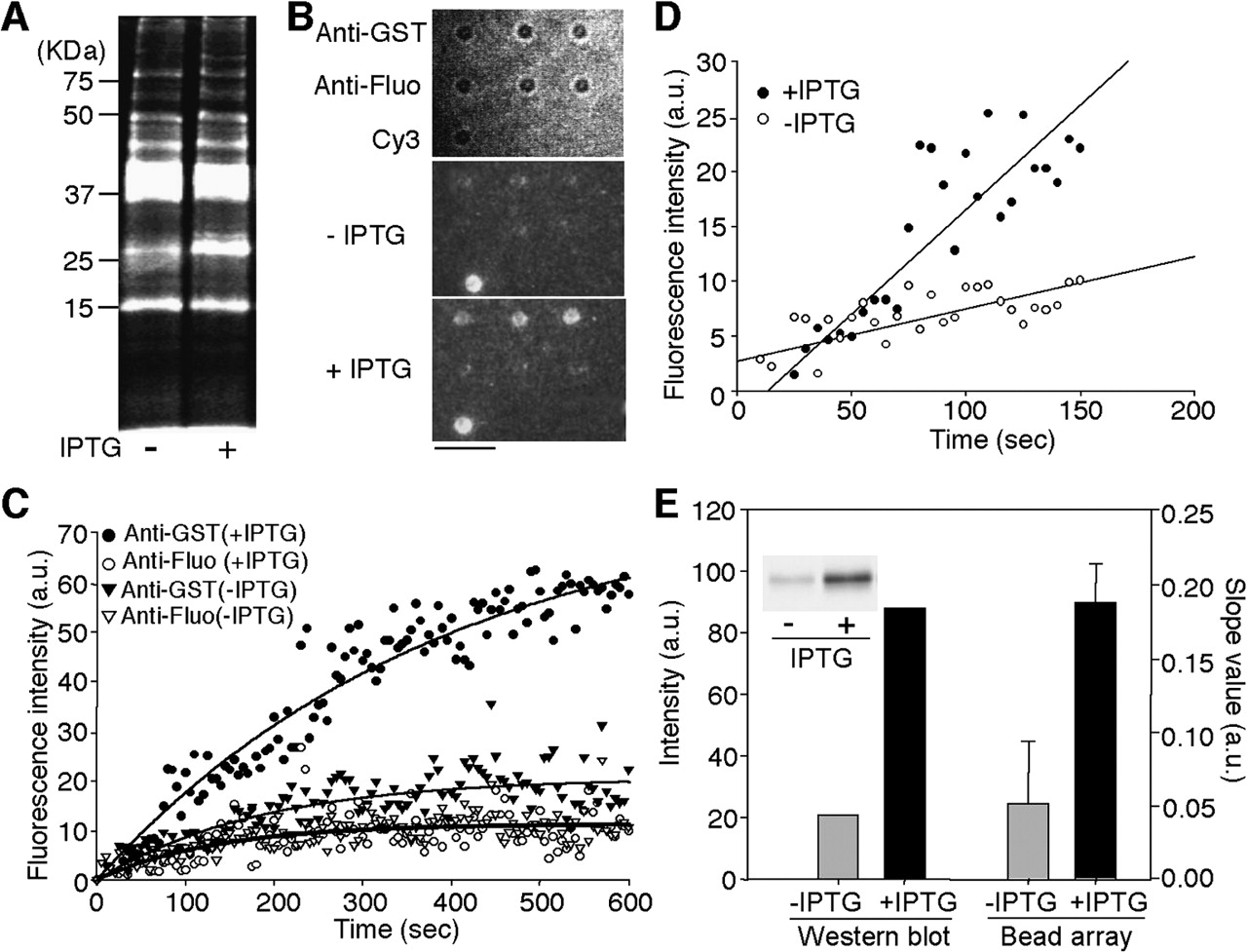 Analysis of protein expression levels in E. coli using antibody-conjugated microbead arrays. (A) Cy3-labeled soluble proteins from two types of pGEX-transformed E. coli, one inducing by 1mM IPTG (+) and the other not (–). Cy3-labeled soluble proteins were analyzed using 12.5% SDS-PAGE with a fluorescence imaging analyzer. The Cy3-fluorescence image is shown. (B) Microscopic images showing the binding of Cy3-labeled soluble proteins to the anti-GST or anti-fluorescein (fluo) antibody-conjugated microbeads after the exposure to 20 nM (in terms of Cy3 concentration; protein concentration, 0.1 μg/mL) Cy3-labeled proteins for 600 sec. (Top) The bright-field image of an antibody-conjugated microbead array. (Middle, bottom) The Cy3-fluorescence images. A Cy3-conjugated microbead (Cy3) was used as a marker for fluorescence imaging. Scale bar, 5 μm. (C) Time courses of the association of Cy3-labeled proteins with anti-GST or anti-fluo antibody. Fluorescence images were collected at 5-sec intervals. The data represent the mean fluorescence intensities from three different microbeads. The black lines represent the fitted nonlinear curves. (D) Analysis of the binding of Cy3-labeled proteins to anti-GST antibody in the early association phase. The slope values in early association phase (∼150 sec) were obtained by a linear fitting procedure. (E) Comparison of GST expression levels by Western blot analysis and antibody-conjugated microbead array analysis. Western blot analysis: Cell lysates were separated by 12.5% SDS-PAGE and analyzed with anti-GST antibody. The protein band intensities are shown. Bead array analysis: The slope values in the early association phase (∼150 sec) are shown. (Inset) A fluorogram of the Western blot. Error bars represent standard deviation from the average slope values observed from three different microbeads.