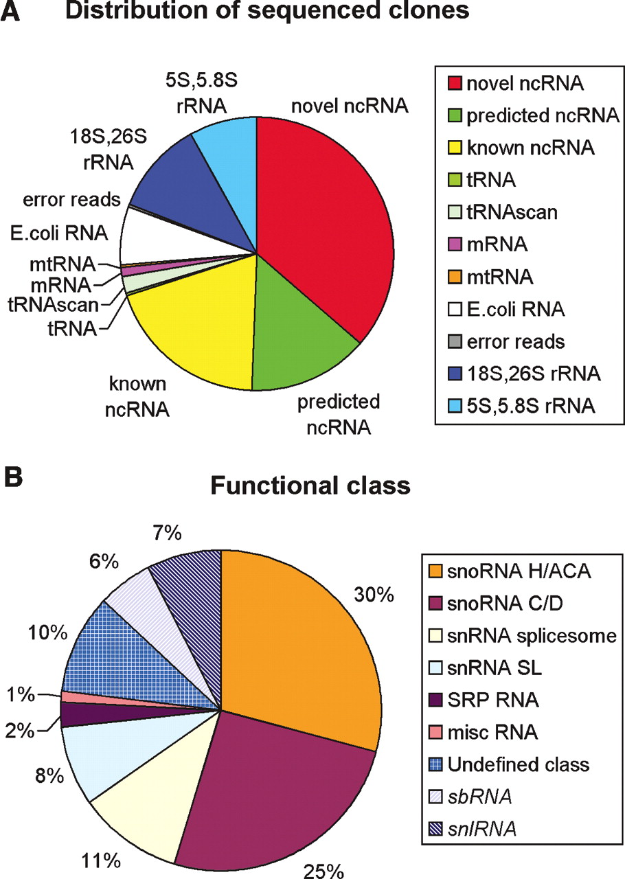 Clonal and functional distributions. (A) Distribution of sequenced library clones on different RNA species and categories. The E. coli RNAs are contaminants from food bacteria ingested by C. elegans. (tRNAscan) tRNAs detected by tRNAscan (Lowe and Eddy 1997); (mtRNA) mitochondrial RNA. (B) Functional distribution of all novel and known ncRNAs detected in this study. Sectors representing RNAs of un defined and novel functional classes are hatched or gridded. misc RNA includes RNase P RNA and Y RNA.