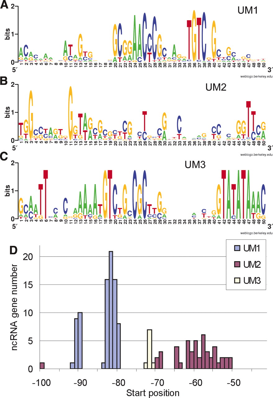 Upstream motifs discovered at ncRNA loci. (A) Upstream motif 1 (UM1; E = 4.0 × 10–521). (B) Upstream motif 2 (UM2; E = 7.3 × 10–179). (C) Upstream motif 3 (UM3; E = 1.1 × 10–38). (For explanation of E, see Fig. 2.) (D) Distribution of distances from motif position 1 of UM1, UM2, and UM3, respectively, to 5′-end of the ncRNA transcripts. UM1 and UM3 have defined distances from start of the motif to the 5′-end of transcript. The two peaks for UM1 represent distances for loci with (smaller peak) and without (larger peak) an additional TATA-box. The distances between UM2 and transcript 5′-ends are more variable, possibly indicative of post-transcriptional 5′-end processing for this group of ncRNAs.