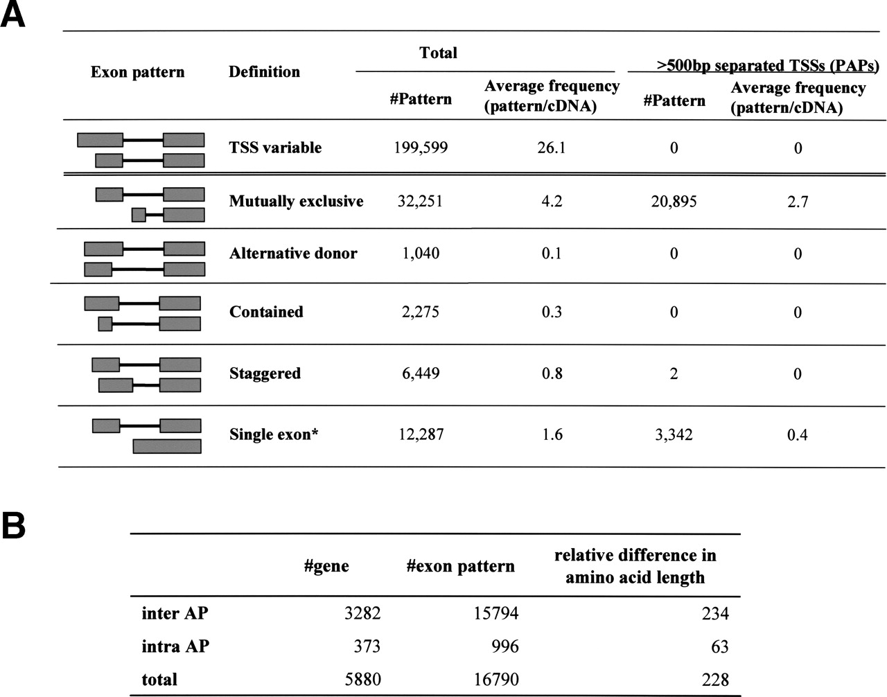 Patterns of the first exons in the PAP-containing genes. (A) Distributions of the patterns of the first exons are shown. The number of identified exon patterns was counted in total (third column) or between the populations which are separated by >500 bp, thus accounting for the separation of the PAPs. *Either of the first exon variations was a “single exon” transcript. Different criteria were employed for them because these transcripts cannot be regarded as “splicing” variants. (B) Alterations of the amino acids resulting from the exon variations occurring in the population of “inter-APs” (TSS distance >500) or “intra-APs” (TSS distance ≤500) were counted.