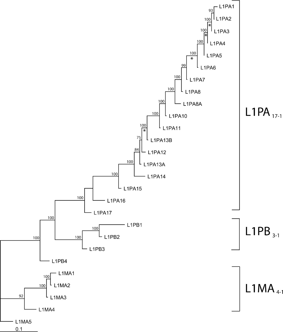 Phylogeny of L1 consensus sequences. This maximum likelihood tree is based on the consensus sequences of the ORF1 and ORF2 of 27 L1 families. The numbers above the nodes indicate the percentages of time the labeled node was present in 1000 bootstrap replicates of the data. Asterisks indicate branches on which the free-ratio model assigned estimates of ω > 1.