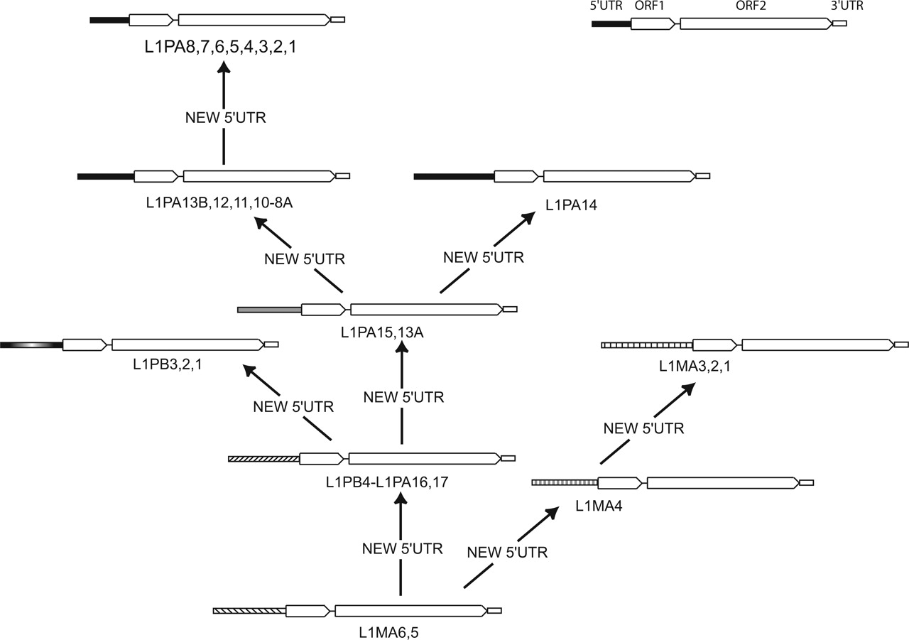 L1 lineages have frequently recruited novel 5′UTR sequences. This scenario was inferred from the phylogenetic tree in Figure 2. An arrow indicates the acquisition of a new 5′UTR. The 5′UTR sequences are drawn proportionally to their size. As the L1PA14 family is nested within the L1PA13A family (data not shown), it is likely that the modern type of 5′UTR was probably recruited independently by the L1PA14 and L1PA13B families.