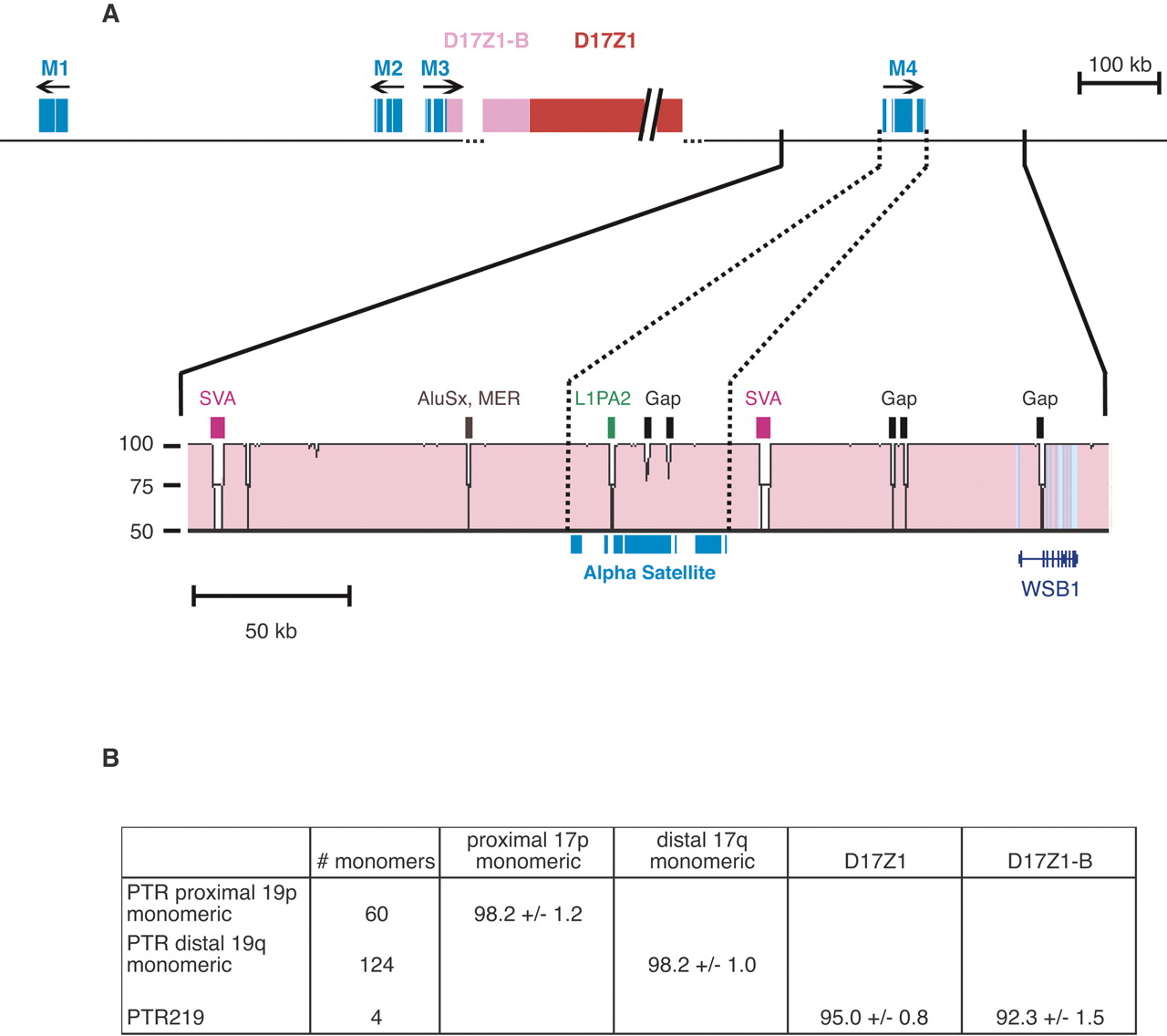 Genomic organization of 17q compared to the orthologous Pan troglodytes region. (A) The genomic organization of the chromosome 17 centromeric region is depicted; α-satellite is colored as described in Figure 1. A 300-kb region containing monomeric α-satellite on human chromosome arm 17q was compared to the orthologous region of chimpanzee chromosome arm 19q. A VISTA alignment of the two regions is shown in pink. Percent identity between aligning sequences is indicated by the y-axis (50%-100% identical). α-Satellite (blue) and the gene WSB1 (purple) are shown. Areas of low percent identity between the two genomes can be explained by gaps in the chimpanzee assembly (black boxes) or sequences inserted in the human genome or deleted from the chimpanzee genome (colored boxes). (B) Mean percent identity ± one standard deviation for aligned α-satellite monomers from chimpanzees and humans.